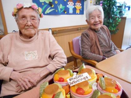 8月のお誕生日のお客様を皆さんでお祝いしました。大好物の果物がたくさんのった、プリンアラモードに喜ばれていました。