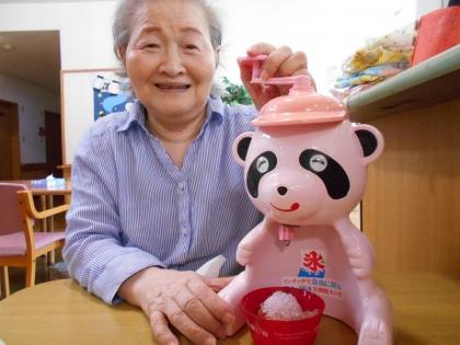厳しい暑さが続き、冷たいおやつが人気でした。レトロなかき氷機と記念撮影しました。出来上がった苺のかき氷に、「冷たくて美味しいね」とお話しされてました。