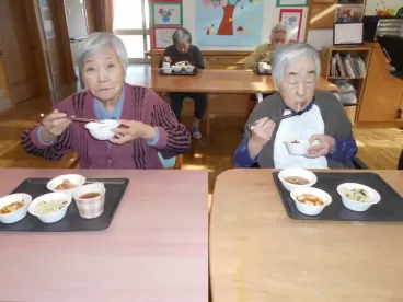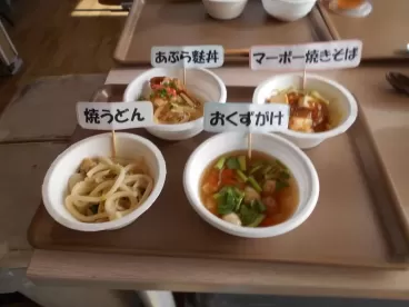 他事業所との合同イベントとして『B級グルメ対決』をしました。おくずかけ、焼うどん、あぶら麩丼、マーボー焼きそばの4種類をご用意し、お気に入りの1皿に投票していただきました。投票の結果、ツクイ袋原グループホーム考案のマーボー焼きそばが、見事1位に輝きました!ご当地グルメを満喫し、皆様完食されていました。