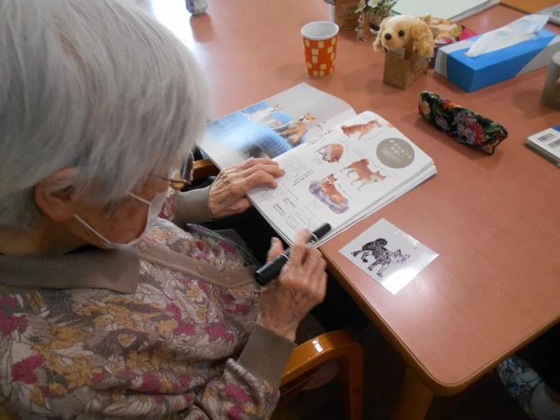 はなみずき棟の様子です。プラスチックのフィルムに絵を描いてオーブンで焼いて作るプラ板を作っている様子です。昔、ご自宅で飼われていた愛犬のポチさんをイメージして描いて下さっています。「全然うまく描けないよ~」とお話されていましたが、とっても丁寧に素敵な絵を描かれていました。