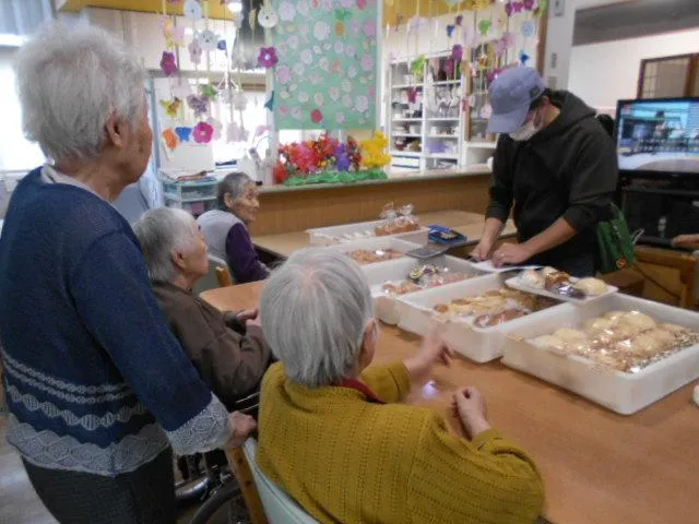 11月より月に二回、パン屋さんに訪問していただける事になりました!ずらりと並んだパンの中からお好みのパンを選んで頂き、おやつの時間に提供させていただきました。「次来た時は何パンにしようかね~」等、会話も弾み、楽しみが一つ増えたご様子でした。
