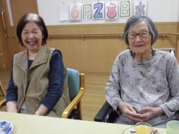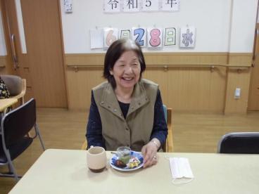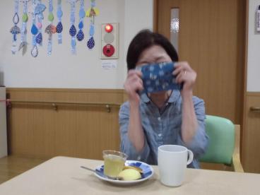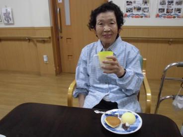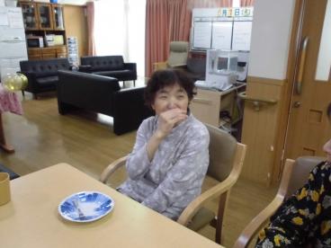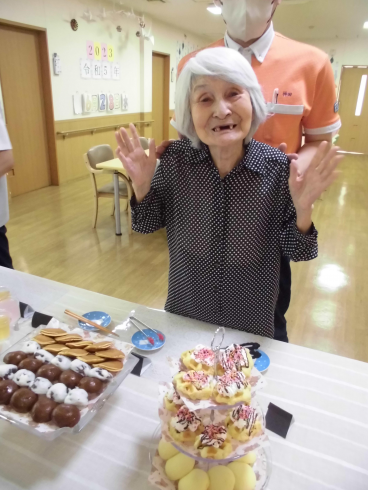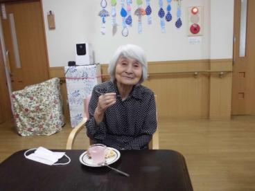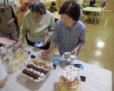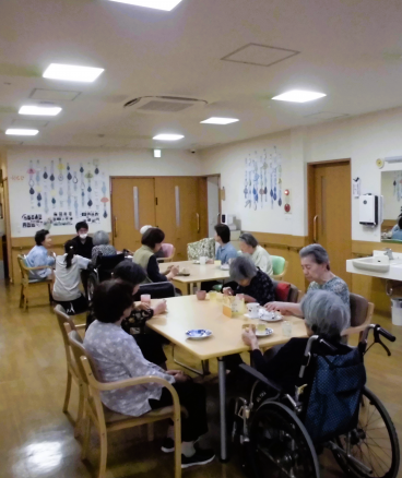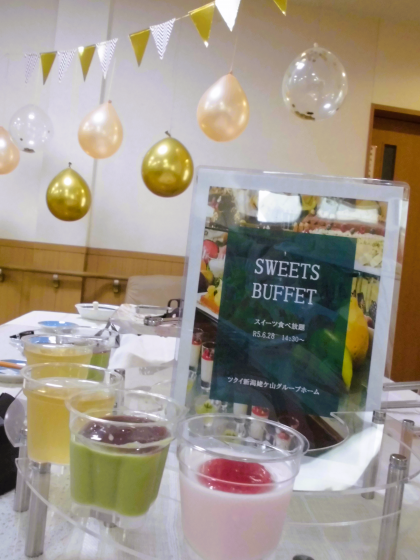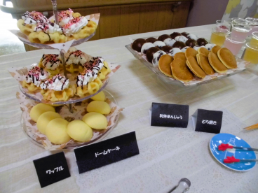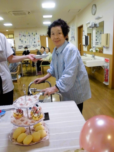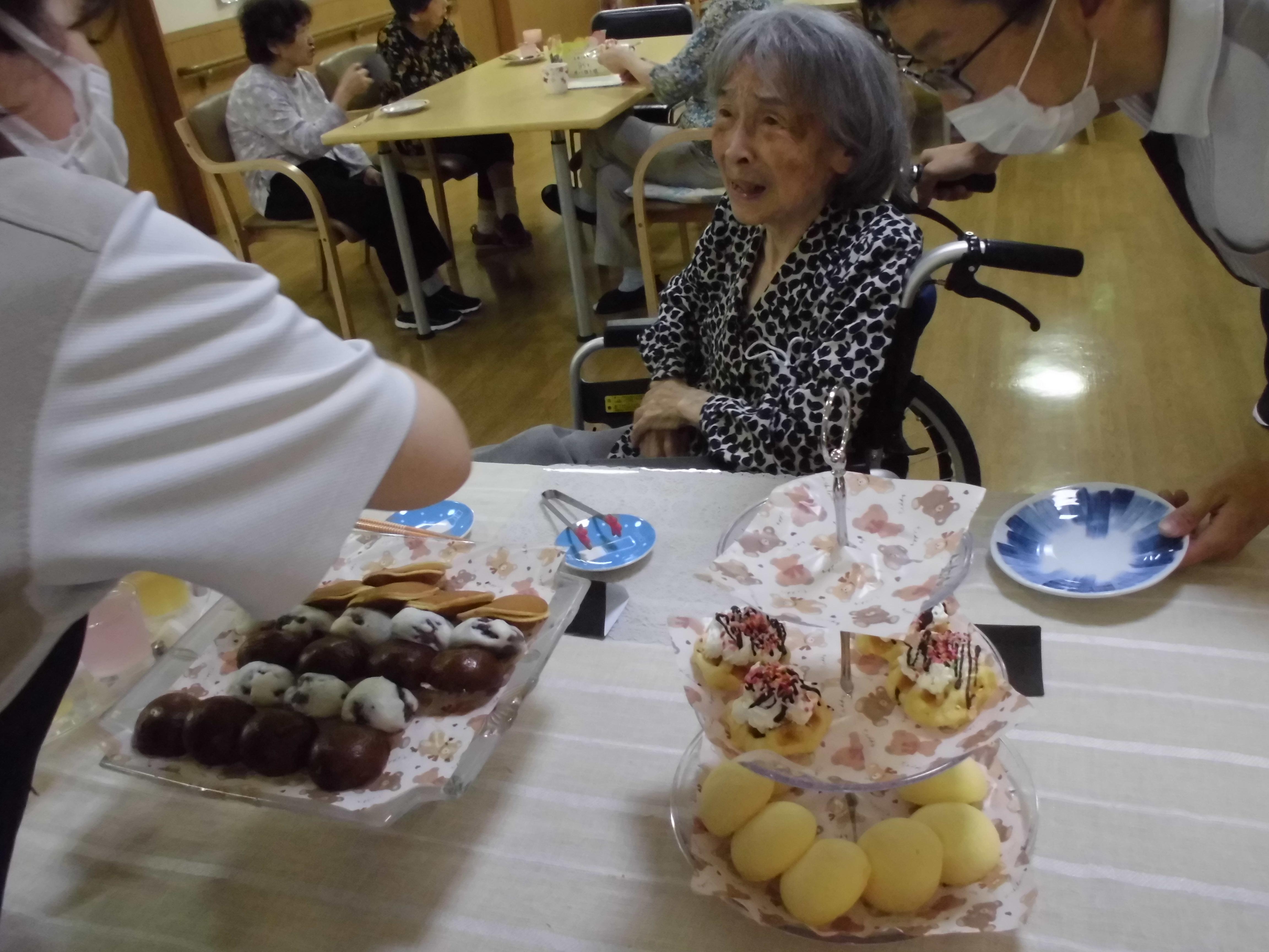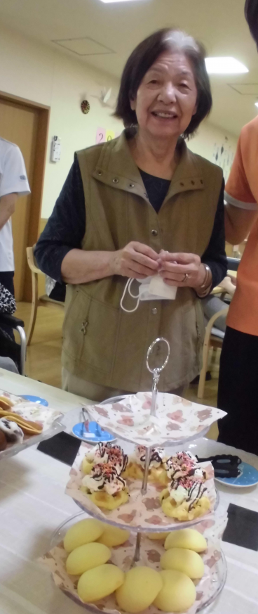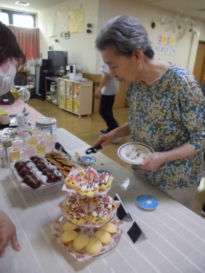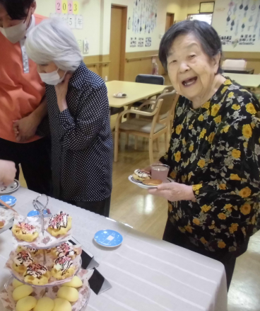 5~6名のグループに分け、順番に好きなデザートを選んでいただきました。日頃の食事では座る位置が決まっているため、話相手も顔見知りの方ばかりですが、おやつバイキングでは、1,2階のお客様、普段会話を交わす機会が少ない方とも一緒のテーブルになり、会話を交わされる姿もちらほら・・・。会場の雰囲気も加わり、会話が弾み笑顔で過ごし、美味しいおやつを堪能されていました。