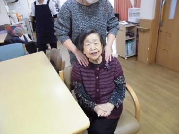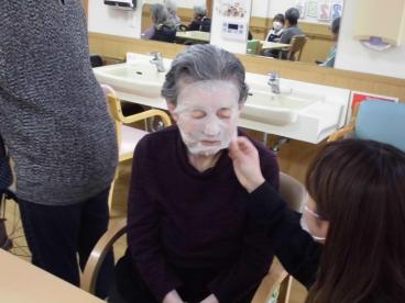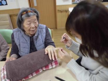 学生さんたちと、お話をしたり、マニュキュア、お化粧、ハンドマッサージ、フェイスパック、肩揉み等をしていただきお客様方もにこにこと笑顔になりました。