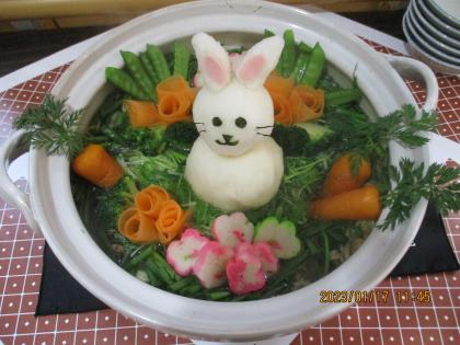 続いて2つ目は、今年の干支「卯」にちなんで、大根おろしでウサギのアート鍋!