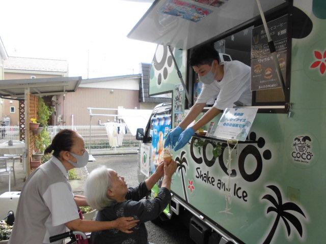 ツクイオリジナルのキッチンカーが施設に!そのソフトクリームは濃厚な味で、お客様・スタッフだけでなく、面会に来られていて一緒に召し上がったご家族からも好評でした。