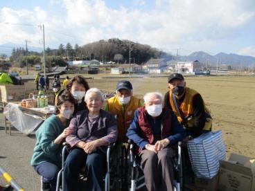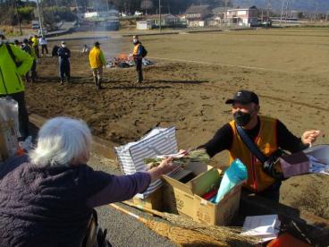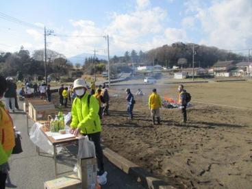 1月13日、みなさんが書いた書初めと正月飾りをもって、地域のどんど焼きに行ってきました。会場にはいつもお世話になっている自治会長や民生委員さんのほか、自治会役員の方々がとびきりの笑顔で迎えてくださいました。