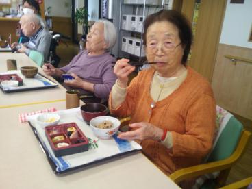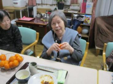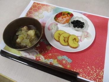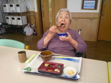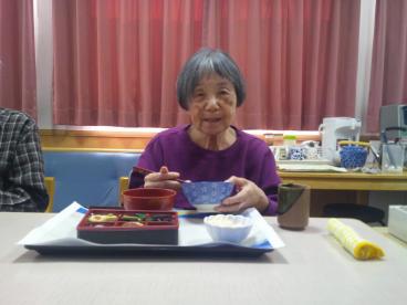 当ホームには大晦日生まれの方がおり、31日のランチはハンバーグ、夜は年越しそば、みかんを食べながらの紅白でした。そして、元旦から3日間はお節料理と甘酒をお出ししました。