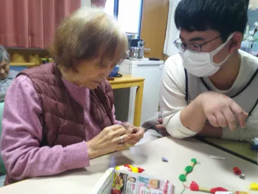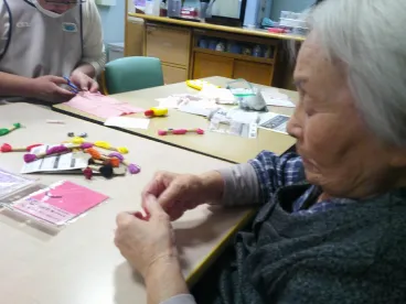 しじみの貝殻とちりめん布を用いたキーホルダー作り。とても細かい作業でしたが、皆さん器用に貼り合わせていました。