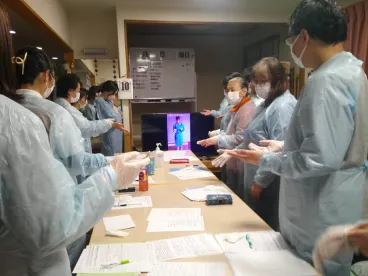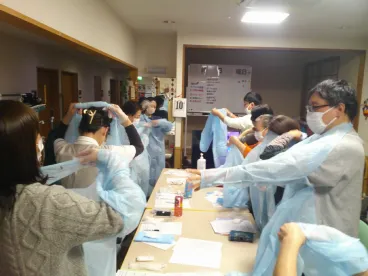 あちらこちらでインフルエンザや新型コロナウイルス罹患の声が聞かれる年末年始。スタッフ一同、いま一度気を引き締めるべく、感染対策委員を筆頭に、ガウンやグローブの適切な着脱方法等々、スタッフ全員で研修会を行いました。
