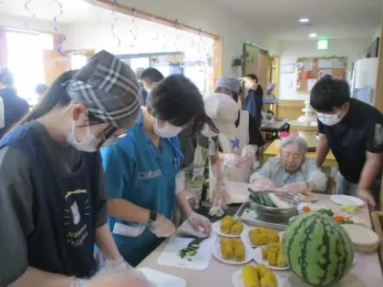 お客様とご家族、ケイロウマッサージさんと学生さんが協力し、すごい量の野菜を切る担当。