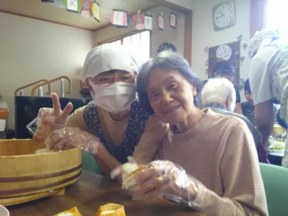 ホームに来てからもずっと、毎週日曜日にお友達の送迎で近所のキリスト教会のミサに参加されているお客様がいます。そんな仲良しのお友達と一緒に、本日はお稲荷さん作り担当。
