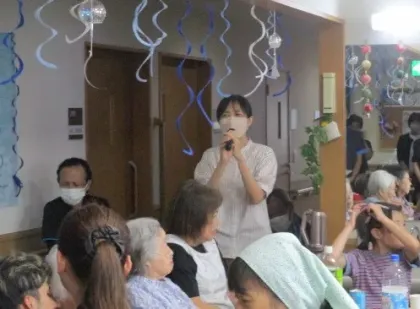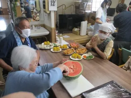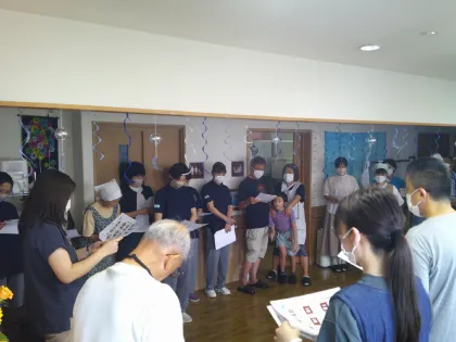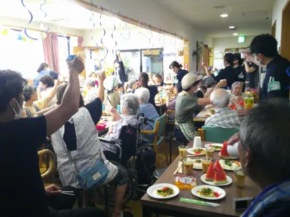 今年の夏まつりには、13名のご家族とご友人のほか、厚木市役所職員、包括支援センター職員、介護相談員などの行政職員をはじめ、ツクイ厚木荻野グループホームの提携訪問マッサージケイロウ管理者、往診管理薬剤師、近所の高齢者施設施設長や社協デイサービス職員などの医療介護関係者、星槎国際高校の学生ボランティアさんなど、総勢31名の地域の方々がお手伝いに来てくださいました。
