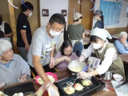 お客様とご家族、地域の方とでお好み焼き作りを担当。