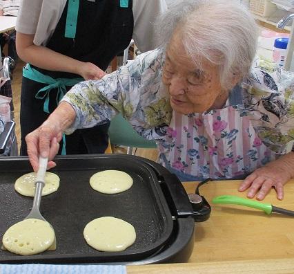 おやつにホットケーキを作りました。「あんこ」や「ホイップ」を好きなだけトッピング。「美味しいね!」と、笑顔もお腹もいっぱいになりました。