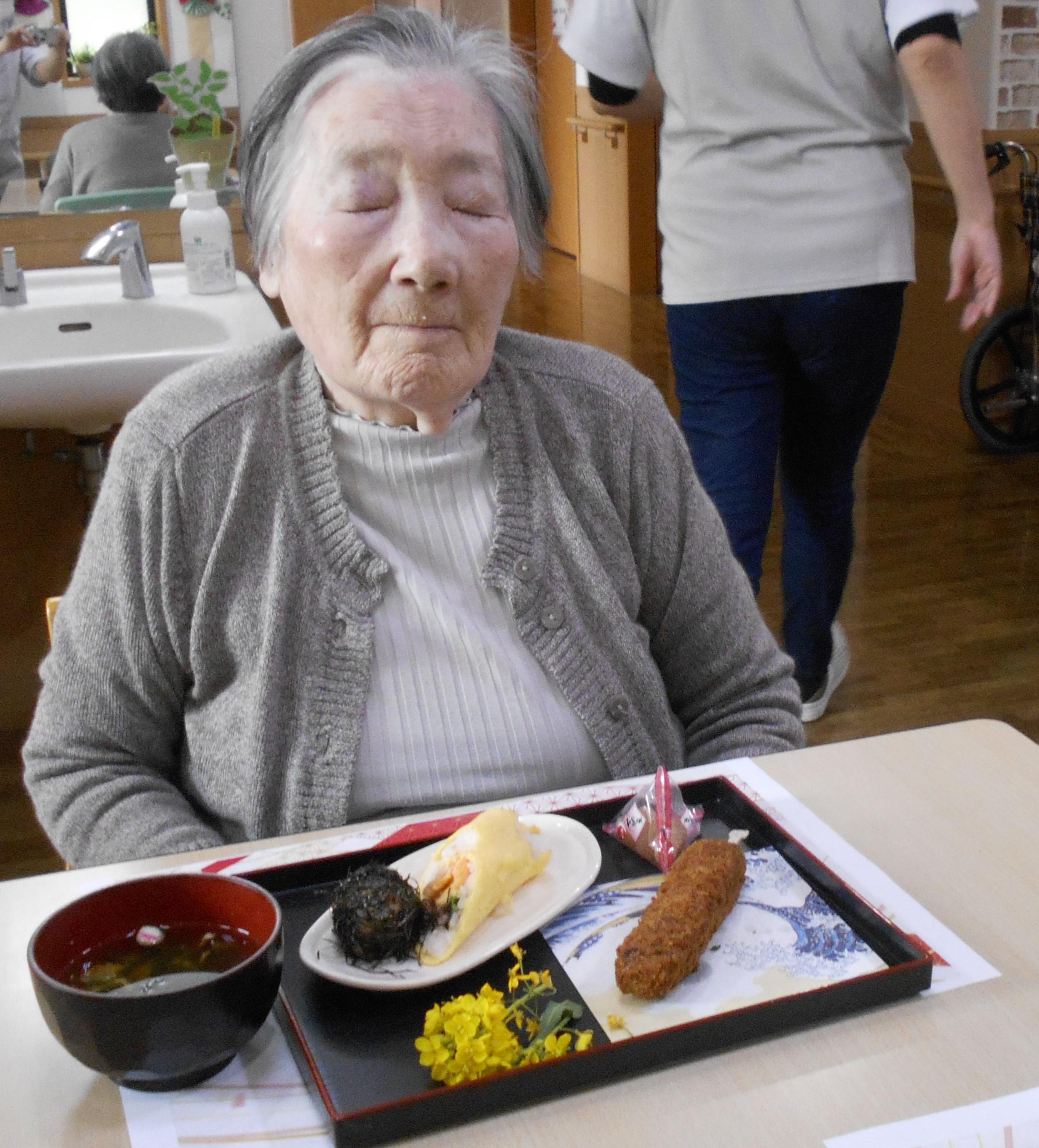 恵方巻と金棒に見立てたコロッケを皆さんで食べました。皆さん美味しそうに頬張っていました。