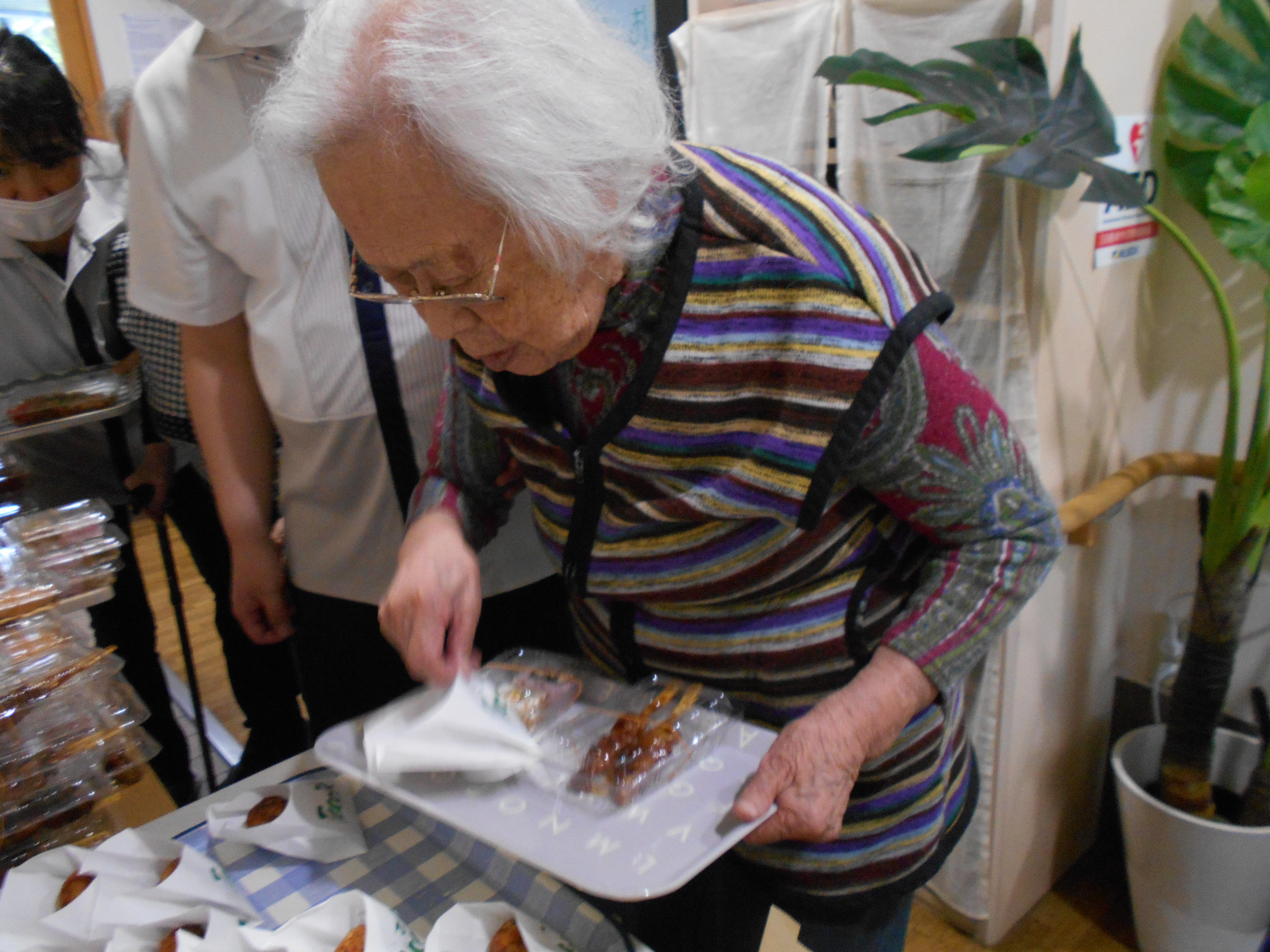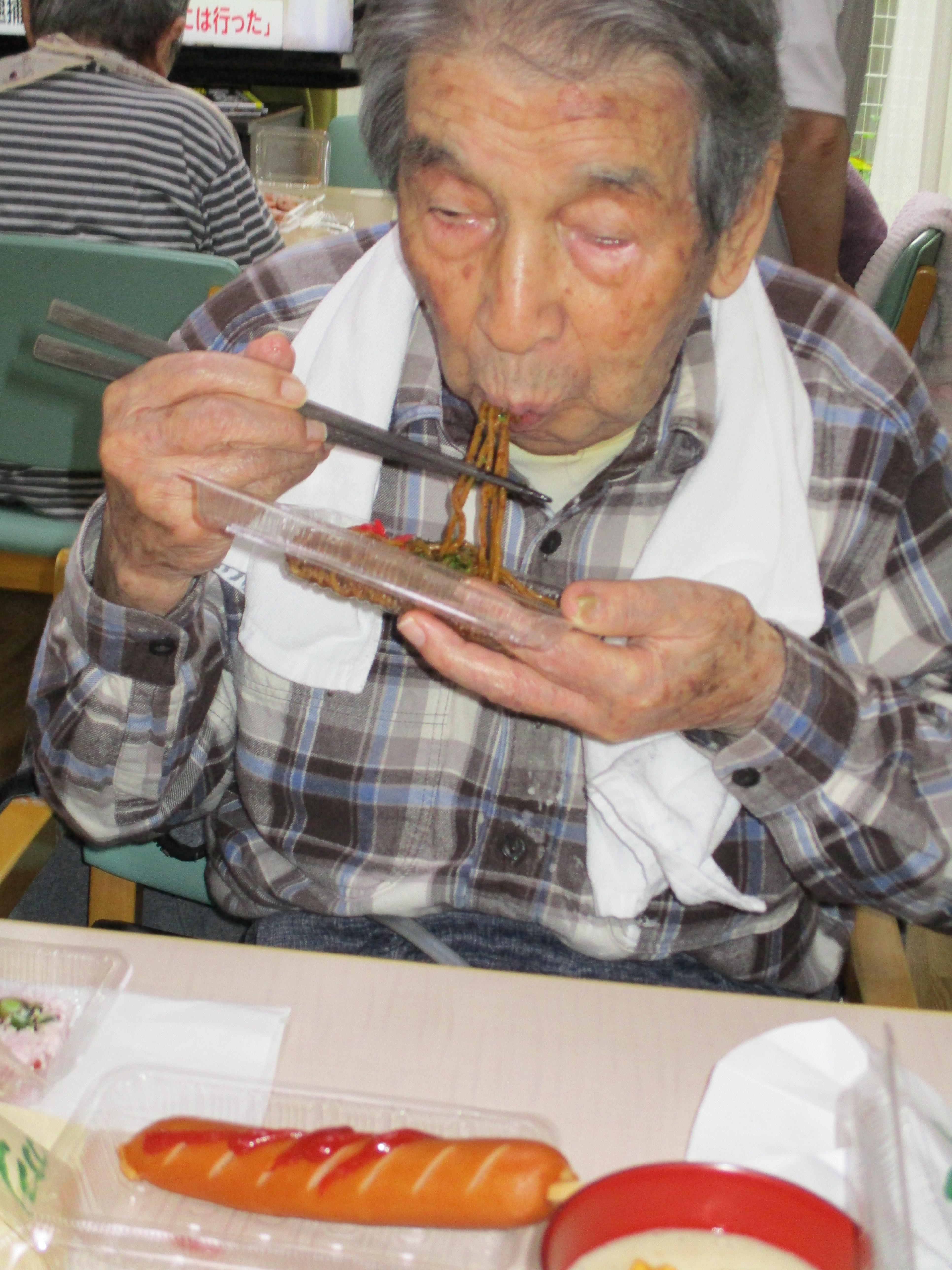 ホームにて秋祭りを開催しました。メニューは、「縁日といえば」と回想法でお客様が出し合って決めました。準備をしていると「私がやってあげる」と皆様集まり、手伝ってくださいました。天気は残念ながら雨だったので、ホーム内で行いましたが、皆様楽しそうに好きなものを選び召し上がっていました。