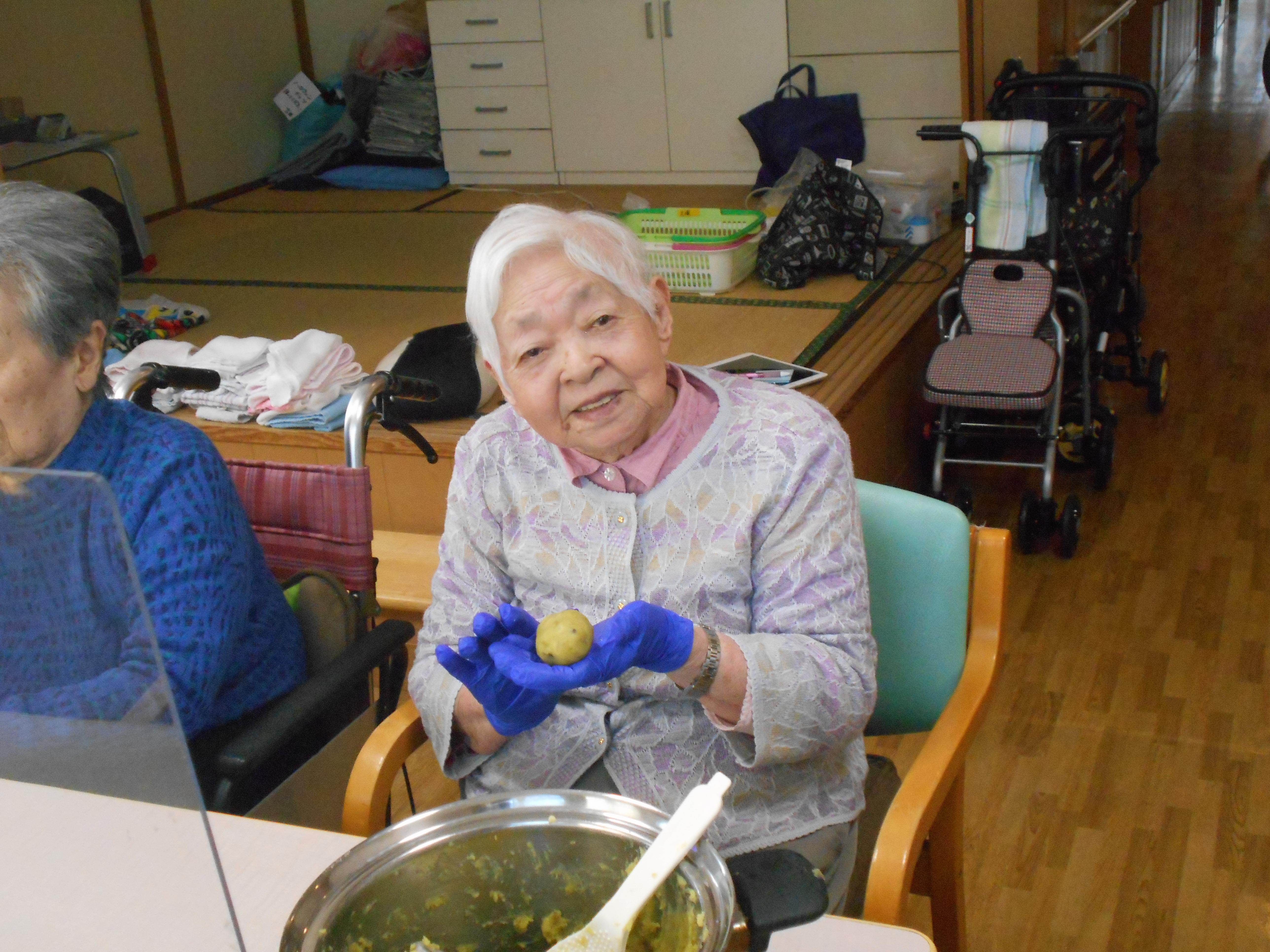 施設内の畑で収穫した【サツマイモ】をおしゃれなスイートポテトに調理し、皆様にお楽しみいただきました。サツマイモの種類は紅はるか、安納芋、シルクスイートなど様々な芋が収穫でき、いろいろな味のスイートポテトができました。