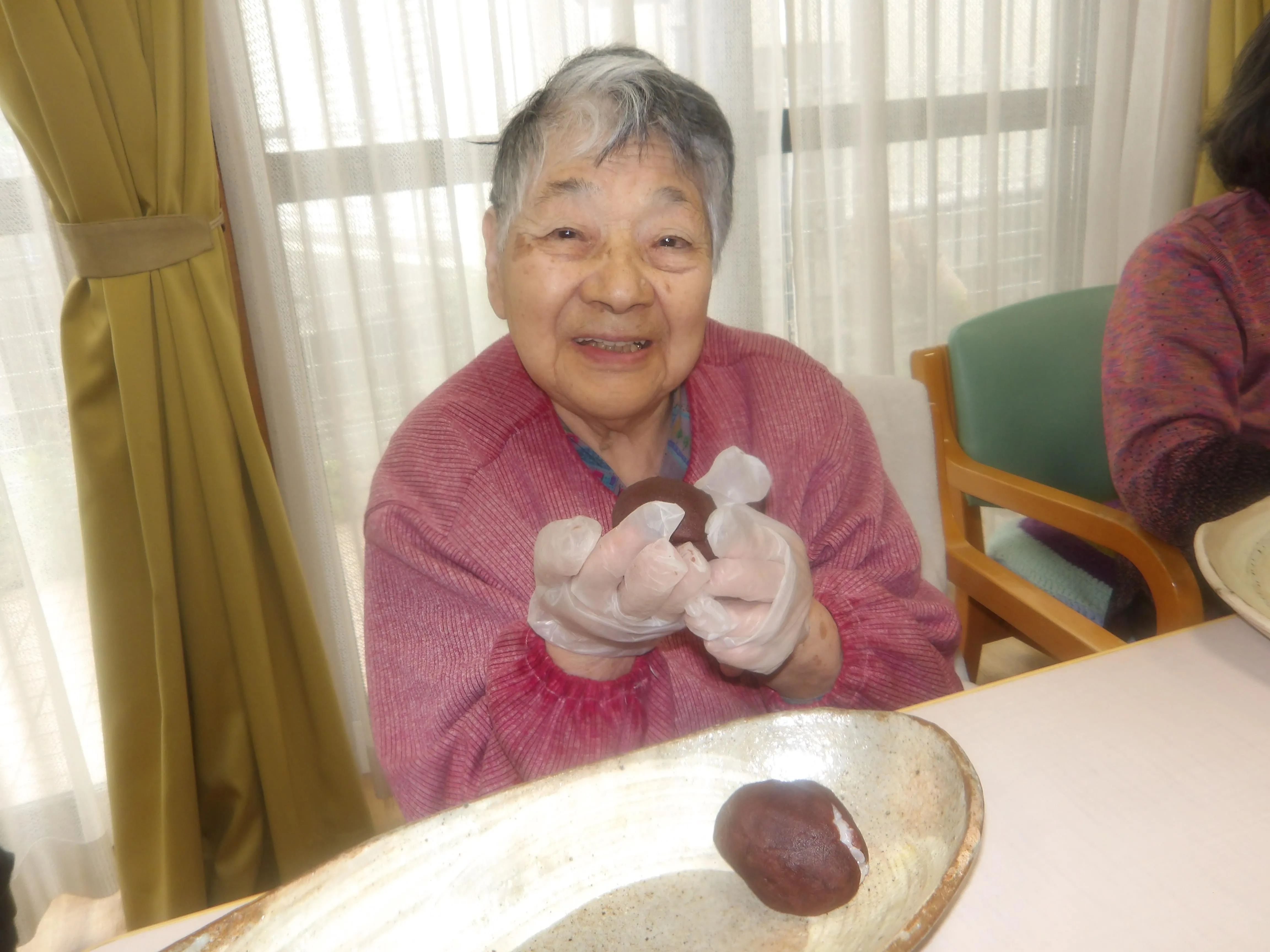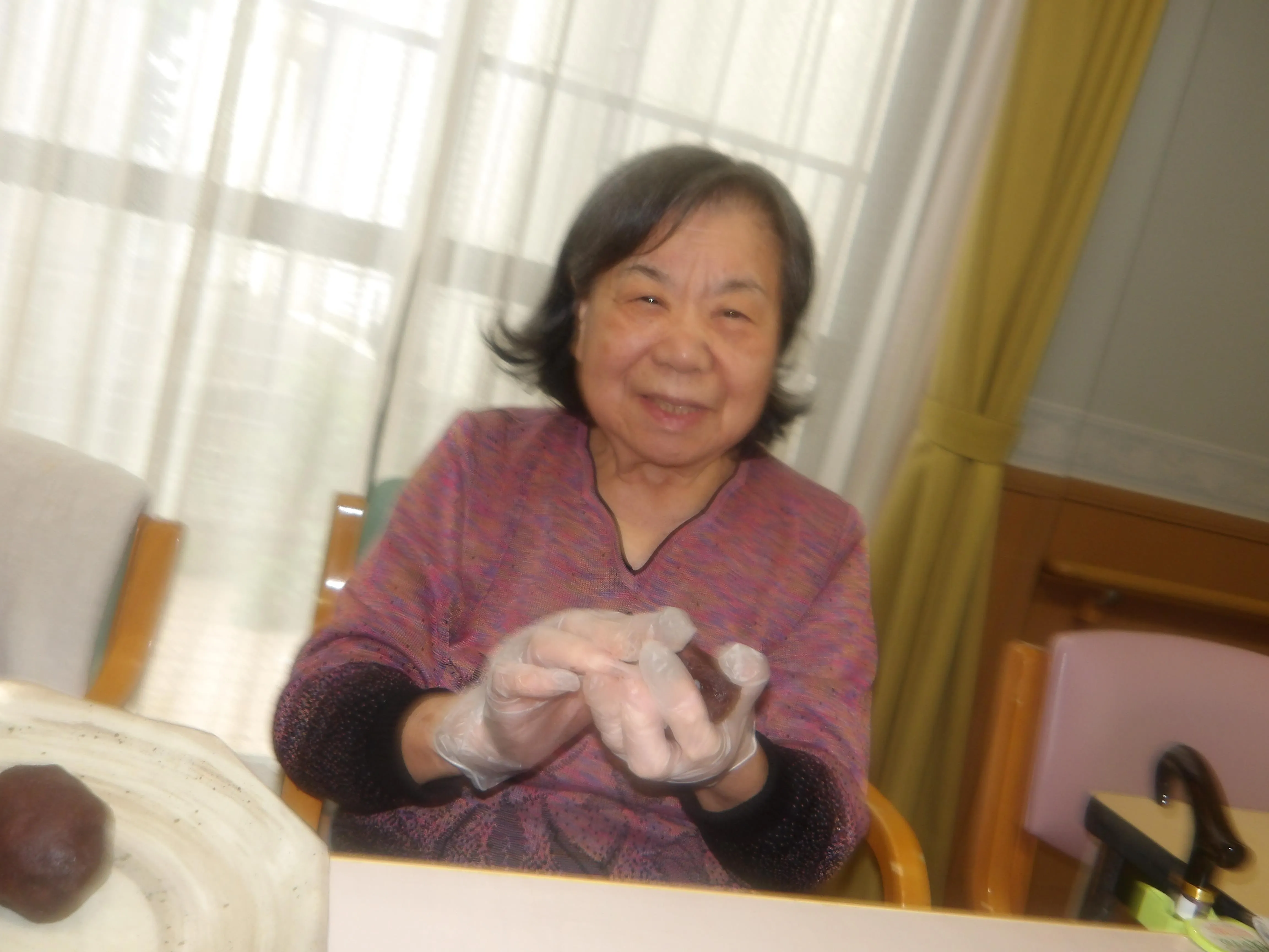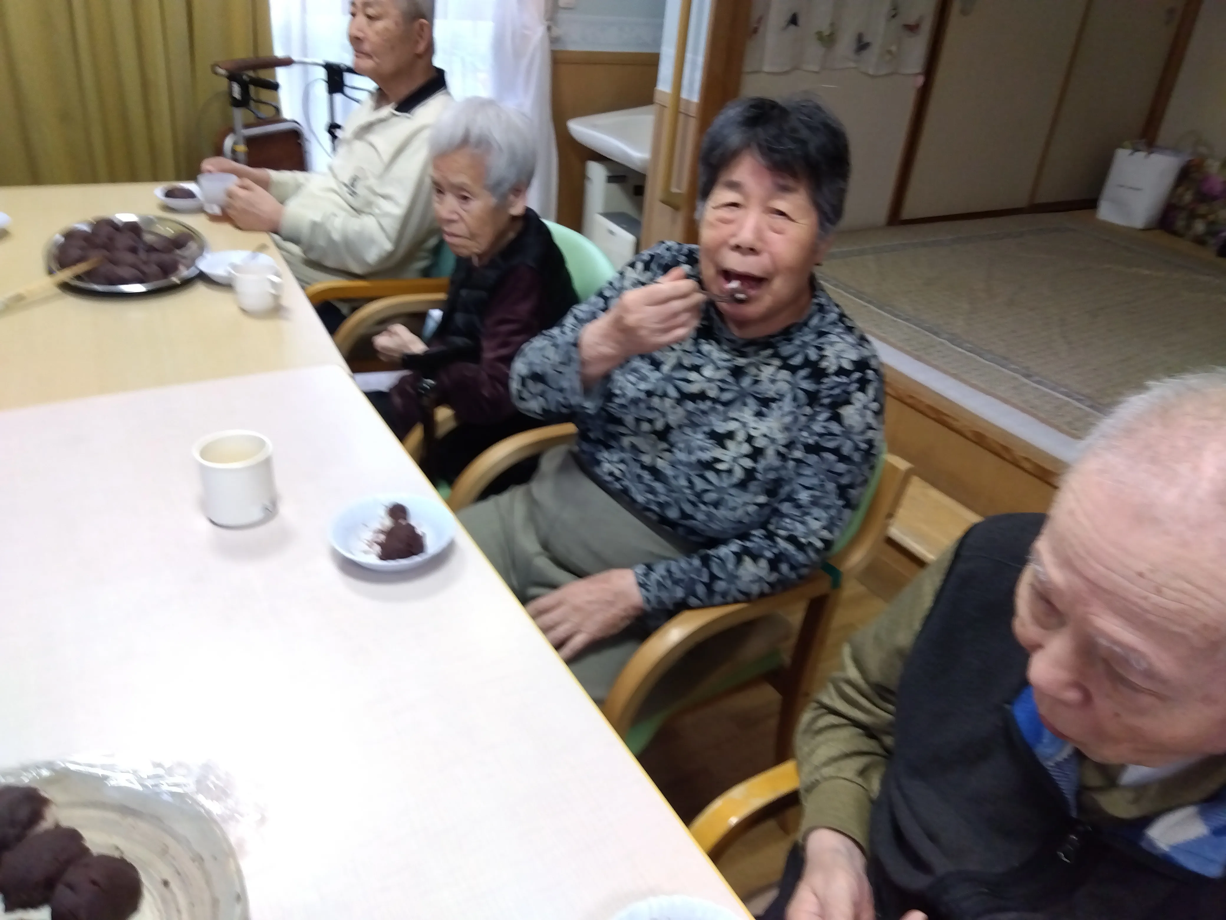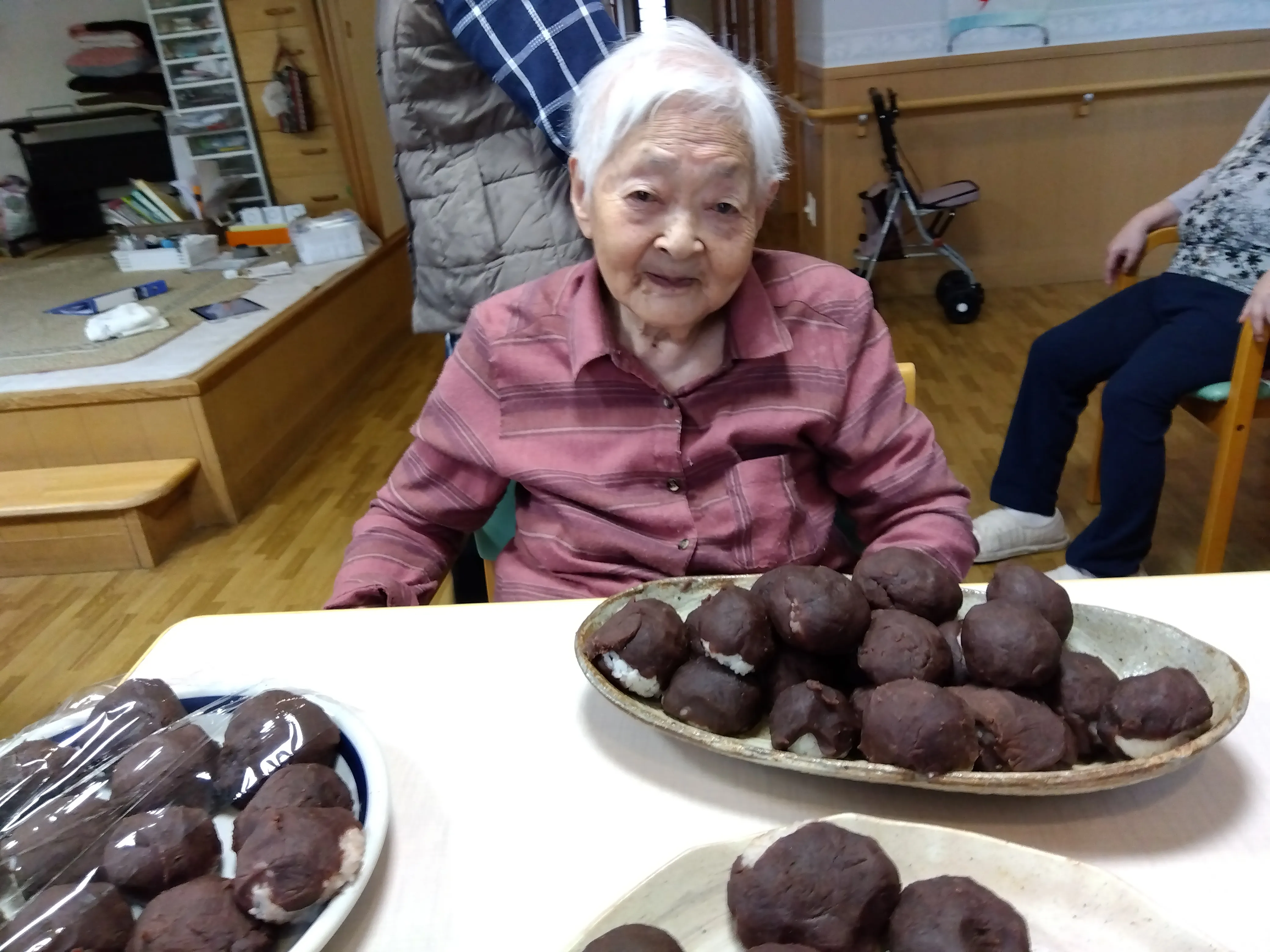 本日は朝より皆様にご協力いただき、おやつで食べるぼたもち作りを行いました。お米は半ごろしにしてもちろん、安全面は配慮しております。大きなぼたもちや、ややあんこが多めなぼたもちなど、様々なぼたもちがなんと!107個もできました。おやつではとてもご好評で皆様、沢山召し上がって、沢山の笑顔を見せてくださいました。