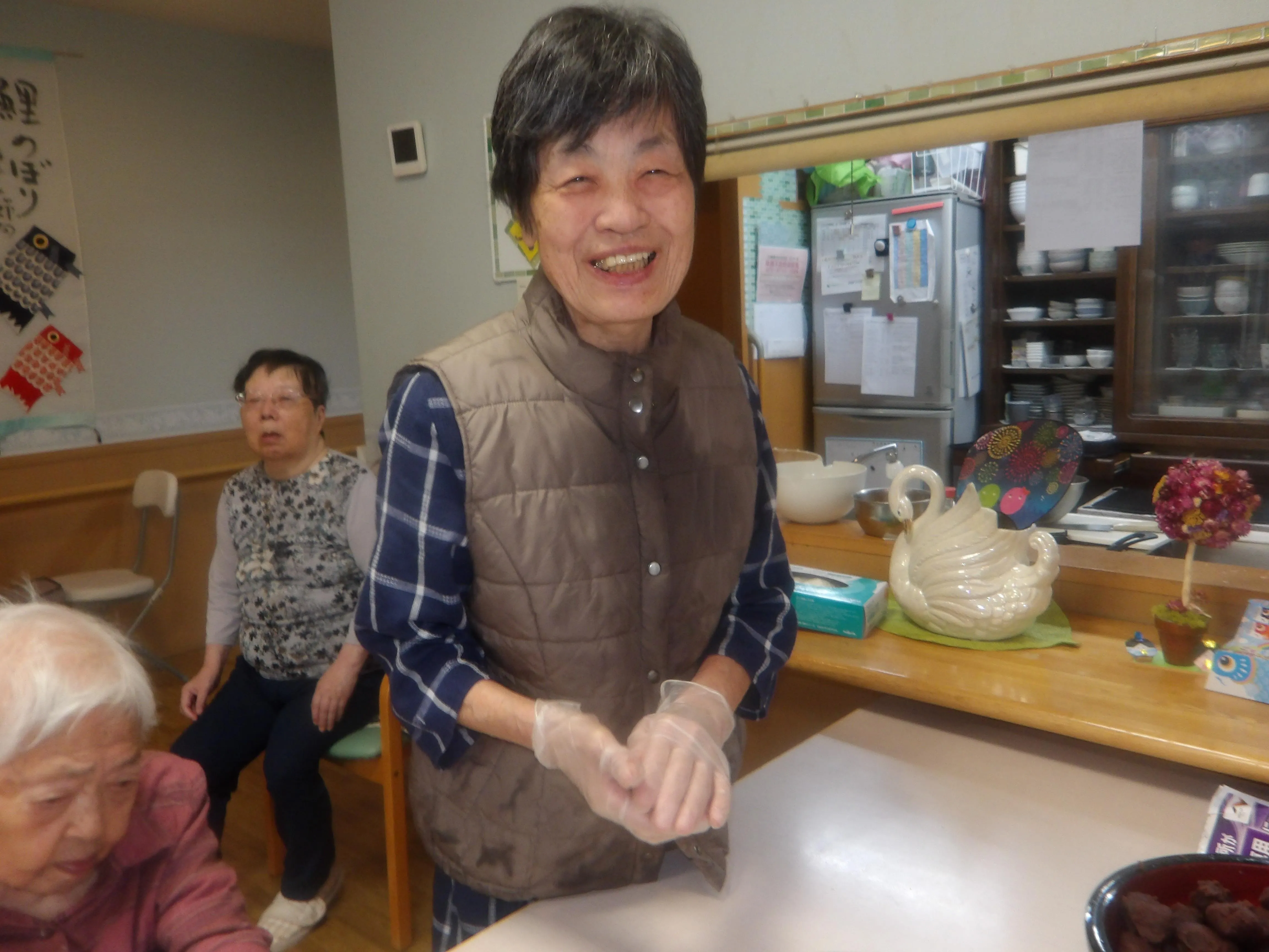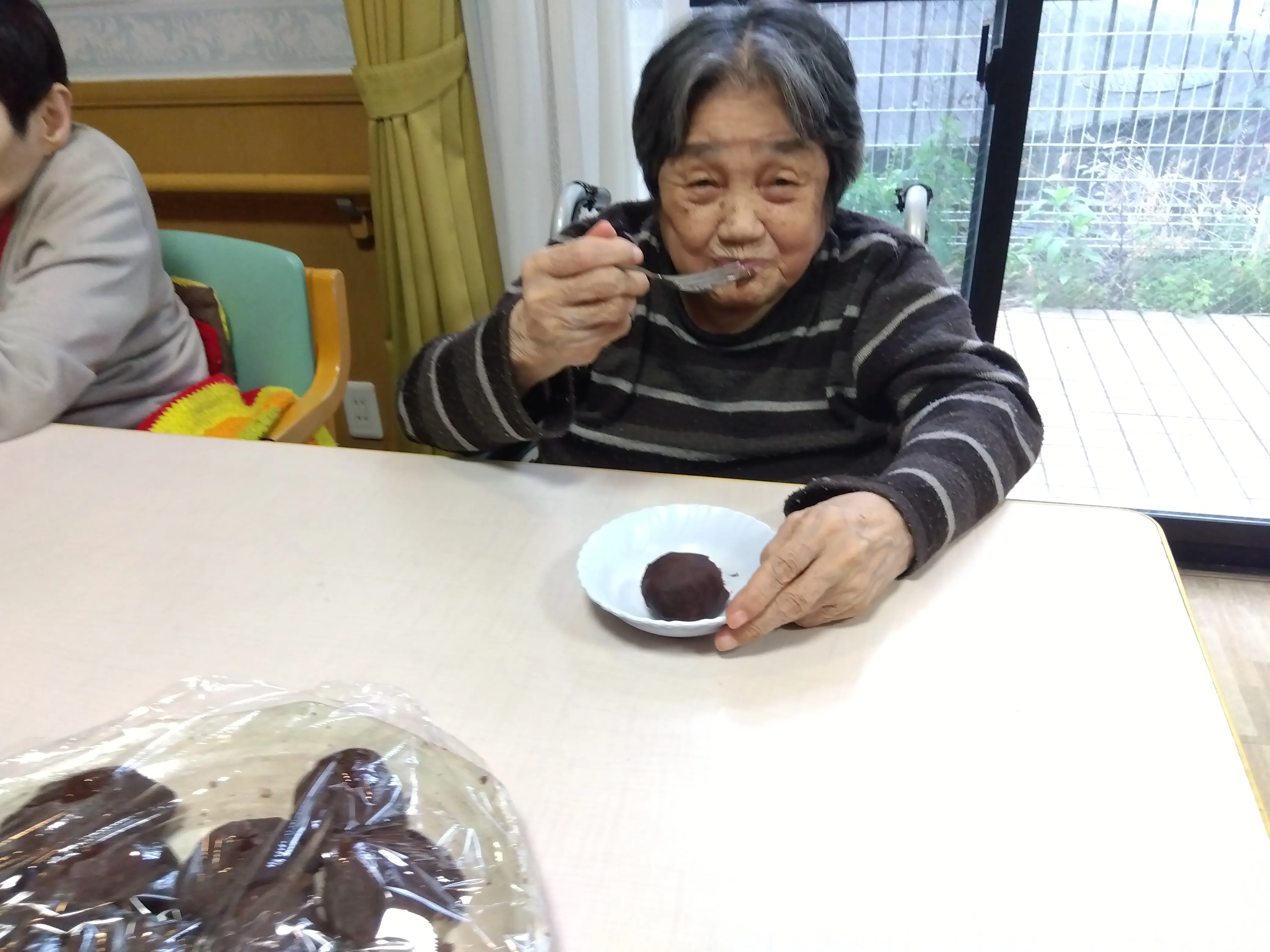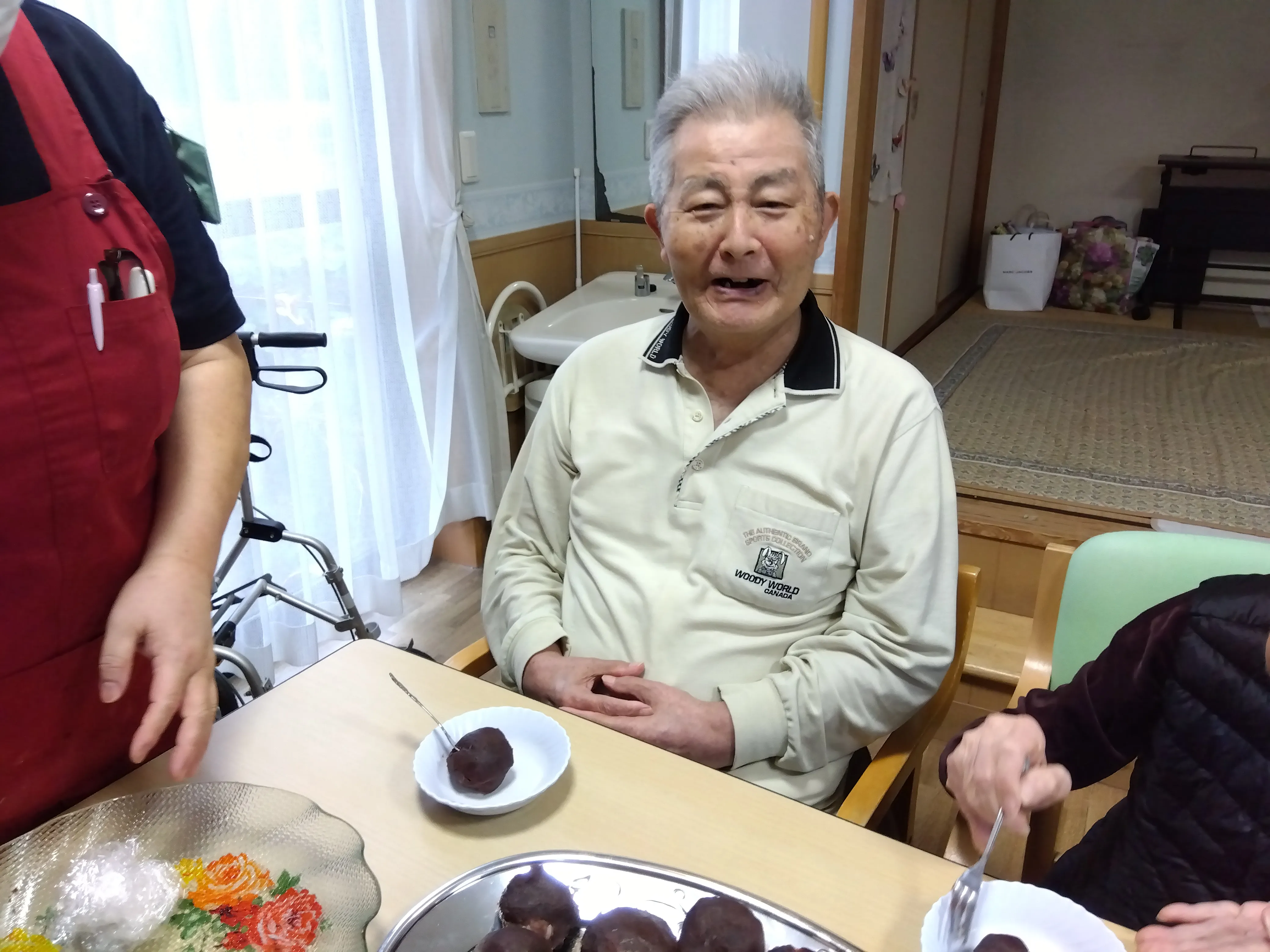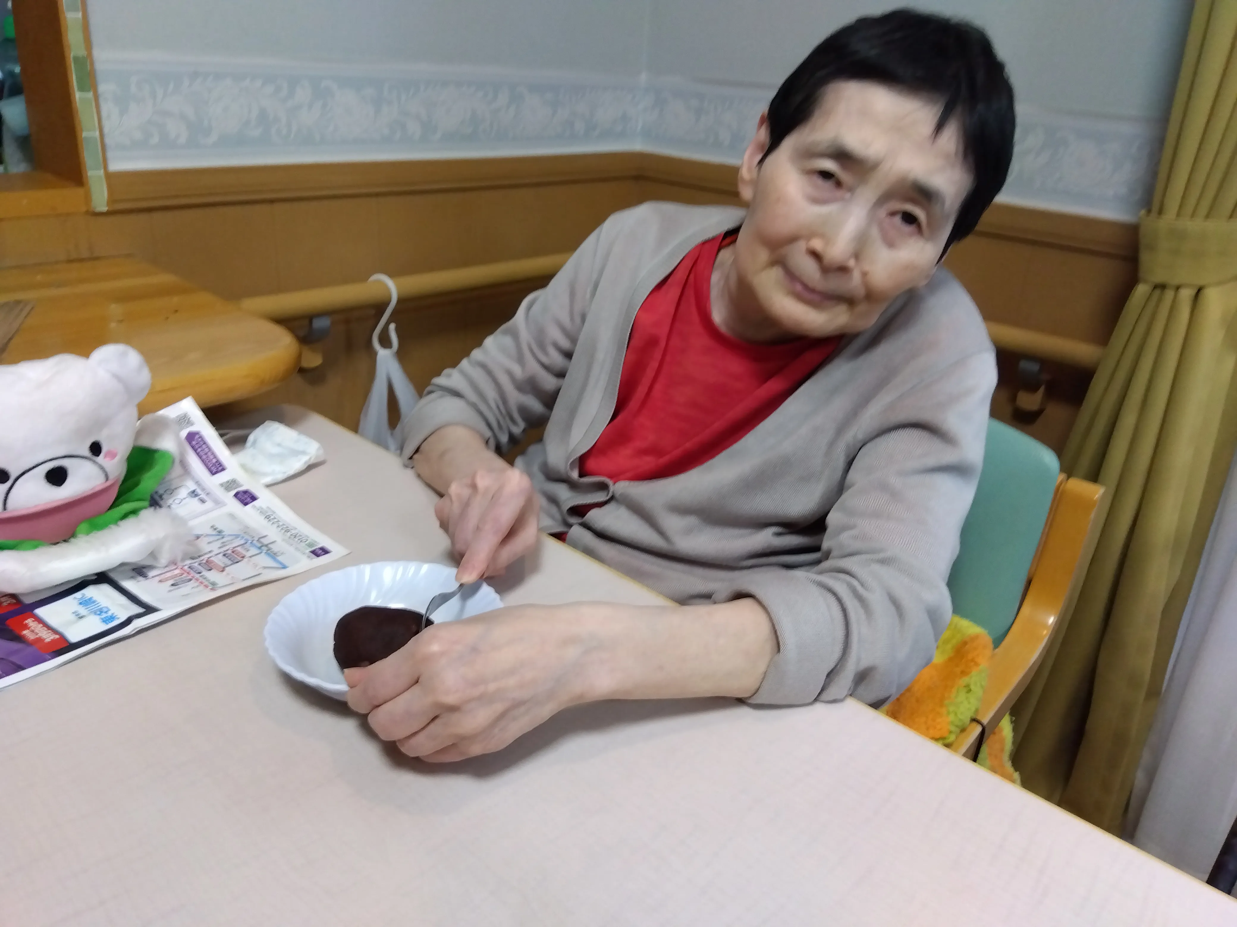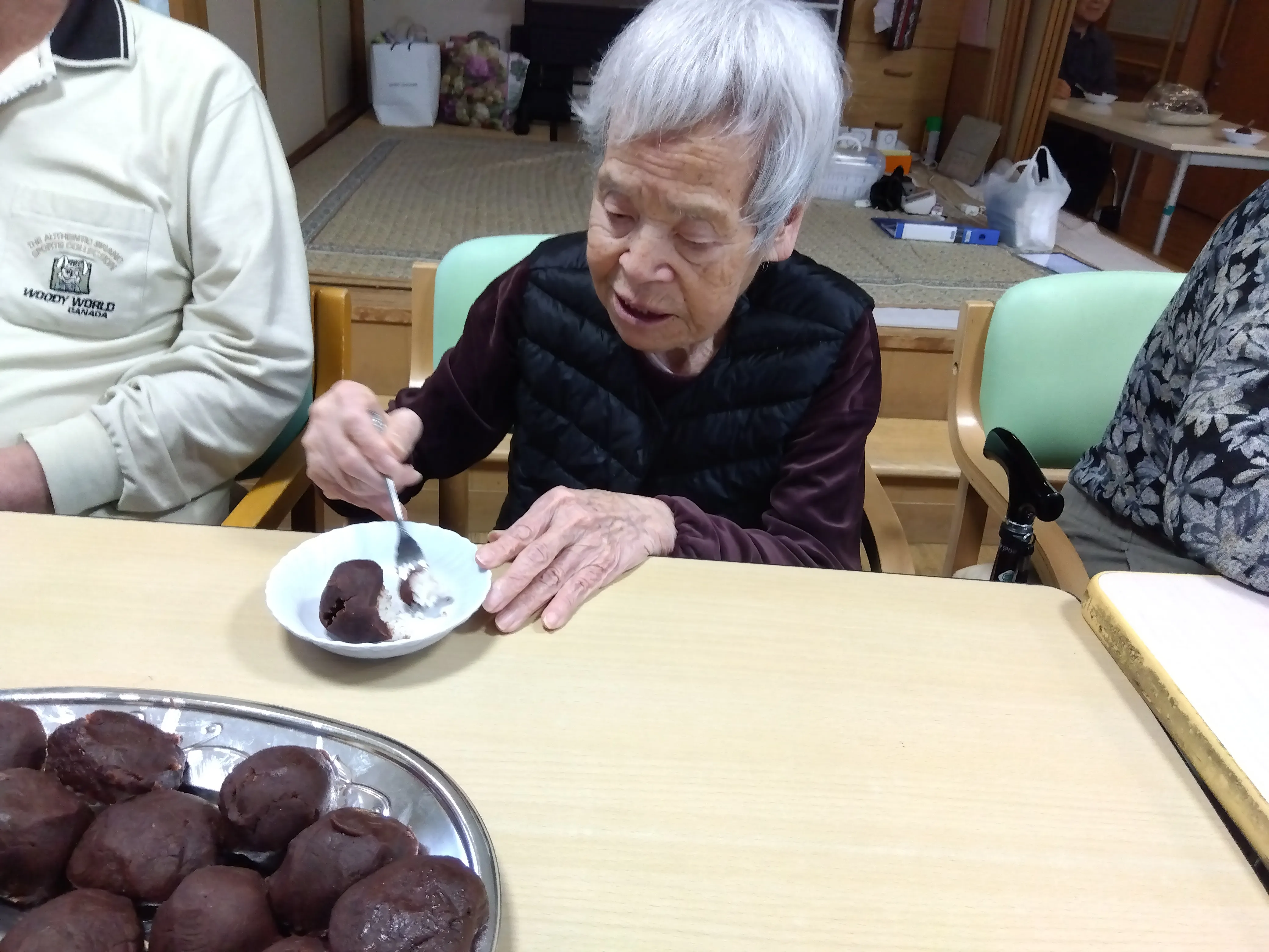 本日は朝より皆様にご協力いただき、おやつで食べるぼたもち作りを行いました。お米は半ごろしにしてもちろん、安全面は配慮しております。大きなぼたもちや、ややあんこが多めなぼたもちなど、様々なぼたもちがなんと!107個もできました。おやつではとてもご好評で皆様、沢山召し上がって、沢山の笑顔を見せてくださいました。