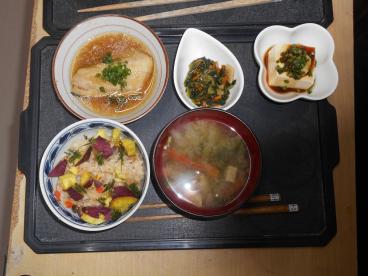 本日の昼食は、秋の味覚キノコとさつまいもの炊き込みご飯です。