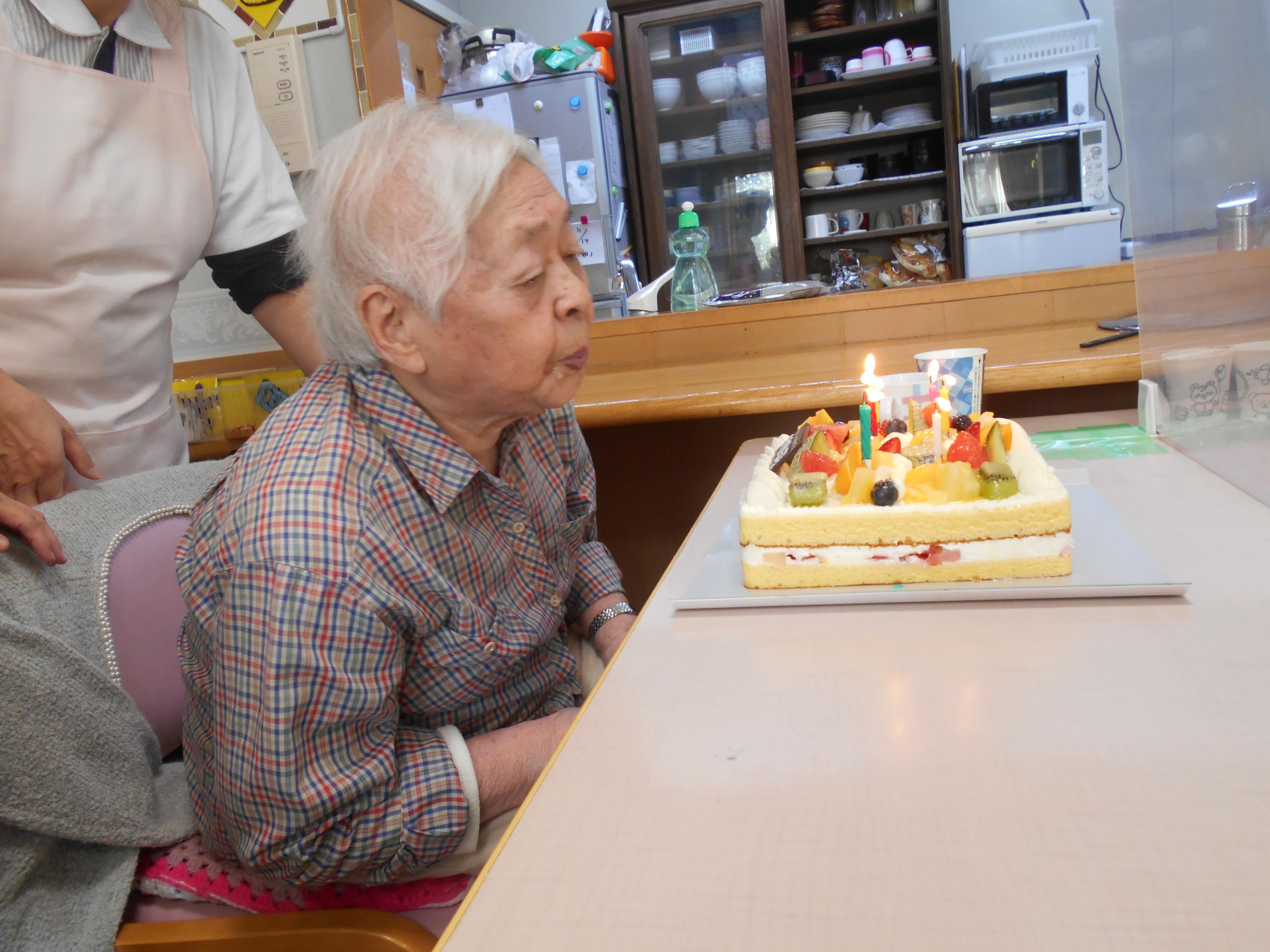 お誕生日の方がおられ、皆様でお祝い致しました。いつまでもお元気でいてください。ケーキが美味しそうですね。甘いものは、幸せな気持ちになりますね。おめでとうございます!