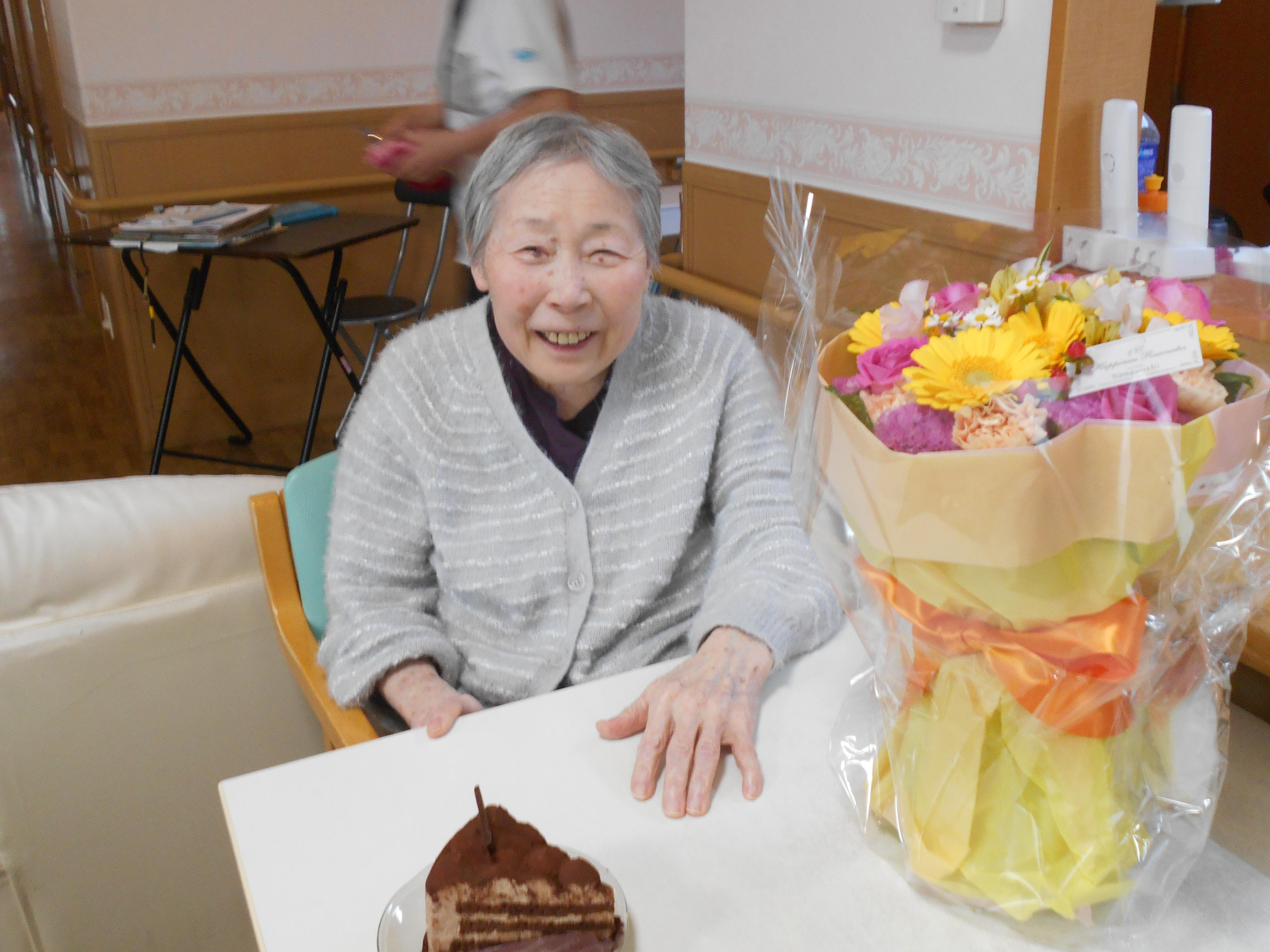 本日は皆様に、職員の演奏にあわせ歌を歌っていただきました。また、ケーキを食べて、一月誕生日の方のお祝いをしました。いつまでもお元気でいてください。おめでとうございます。