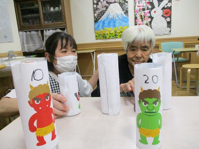 鬼の絵を描いたペットボトルにお手玉を当てて、得点を競う物ですが、2階フロアは更にその中に『福の神』が潜んでいます。間違って福の神を退治してしまったら大変だと、皆様真剣な表情そのもので参加されていました。