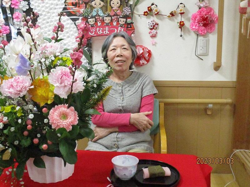 1階フロアは、お花と和菓子と輪投げレクリエーションでひな祭りを楽しみました。
