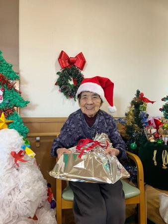 サンタクロースがやってきて、皆様一人一人にプレゼントを届けてくれました。手作りしたクリスマス飾りの前で写真撮影「メリークリスマス」
