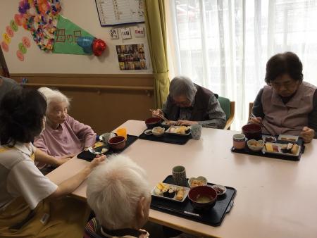5月14日は母の日、日頃の感謝を込めてお祝いさせていただきました。事前にアンケートを取り、1番要望の多かったお寿司、おやつは、お手製パフェを召し上がっていただきました。