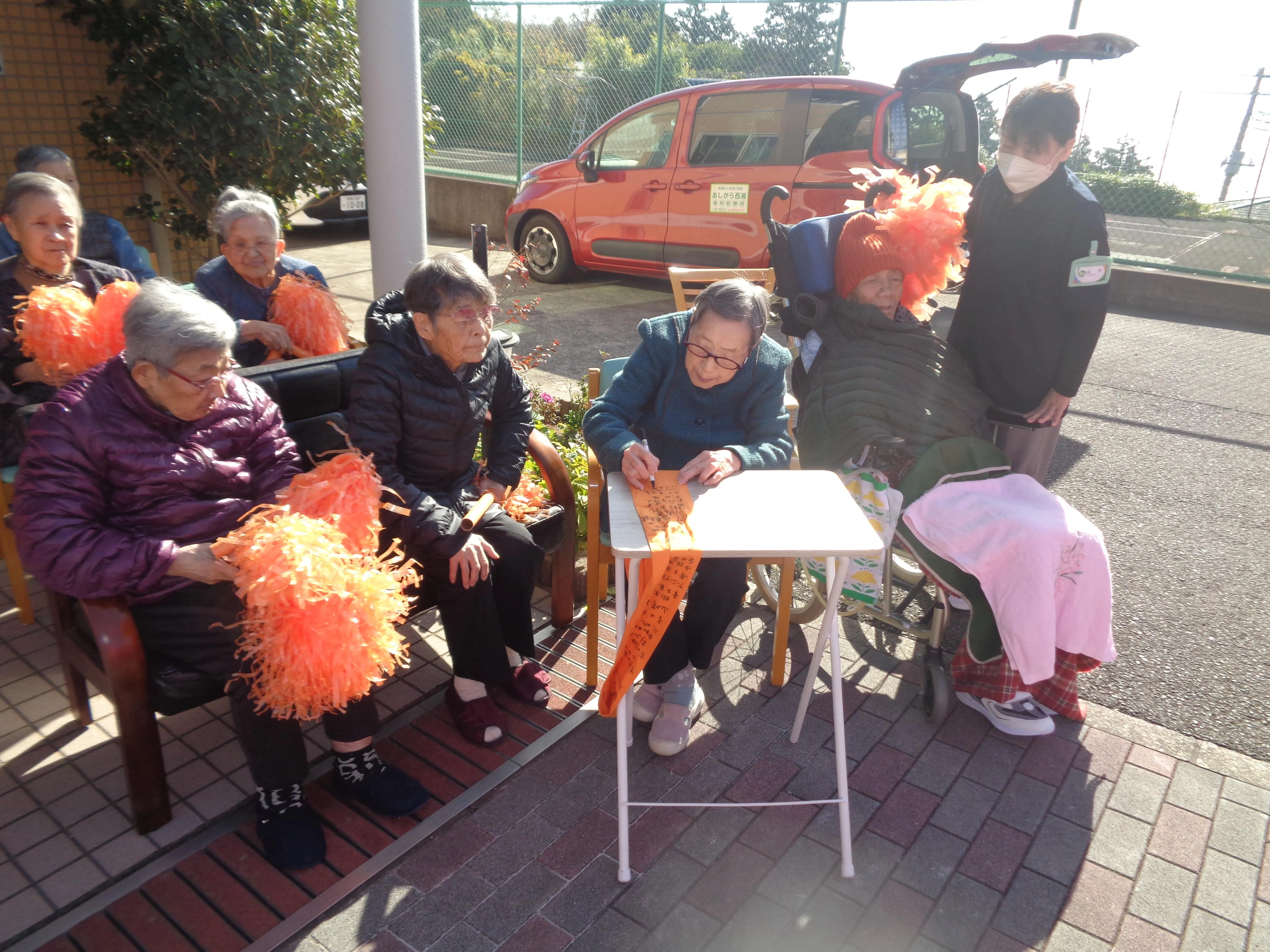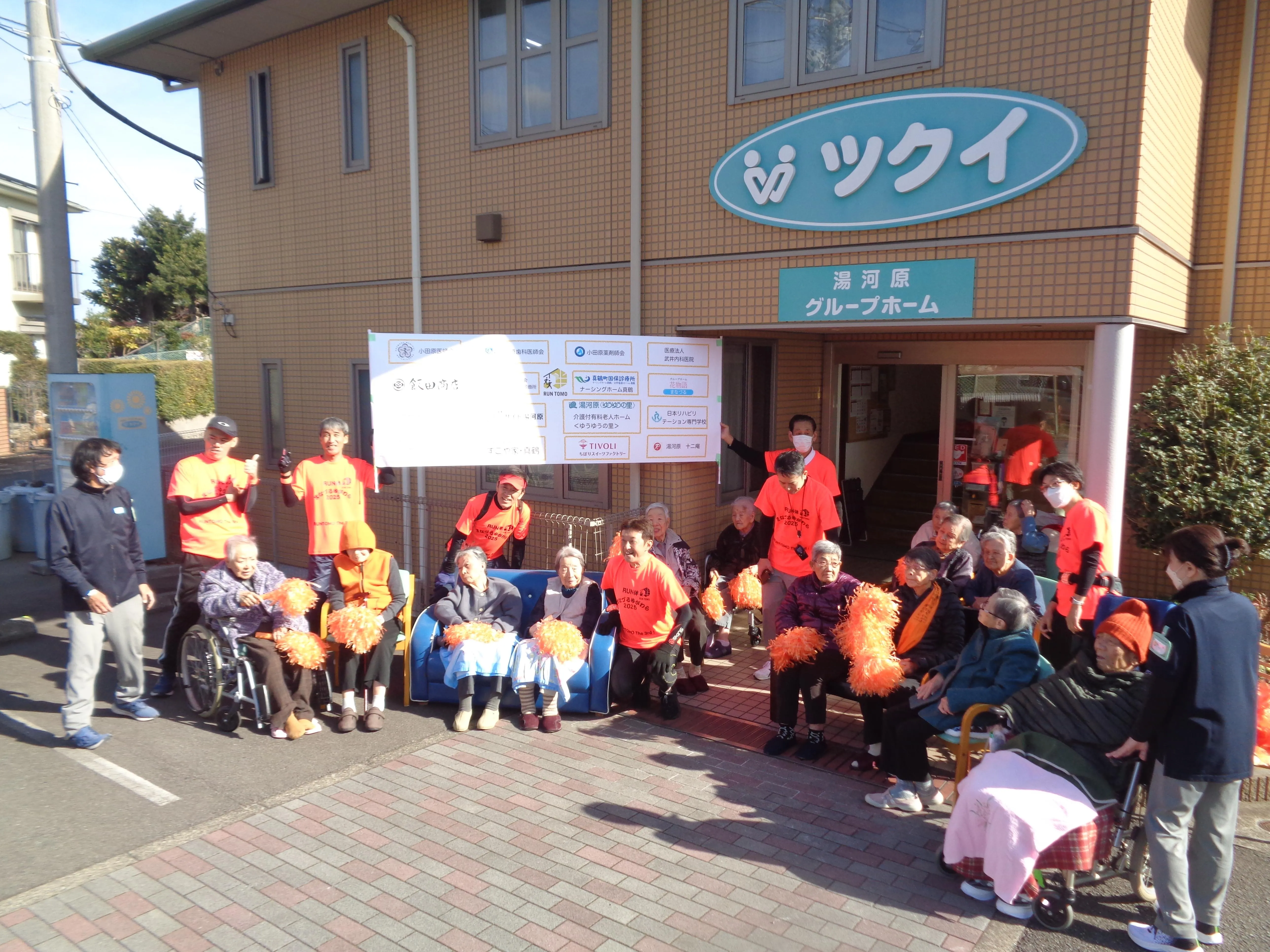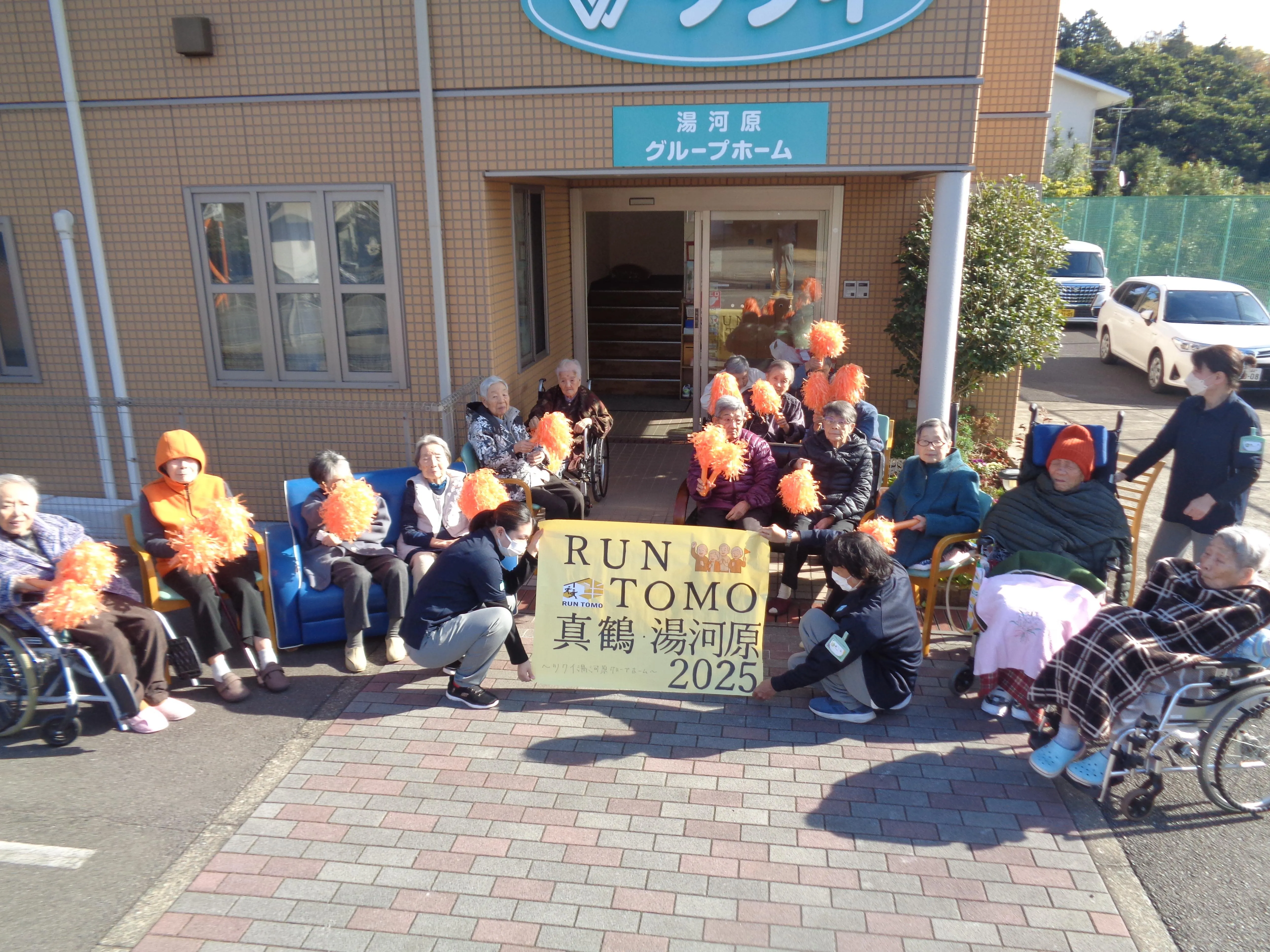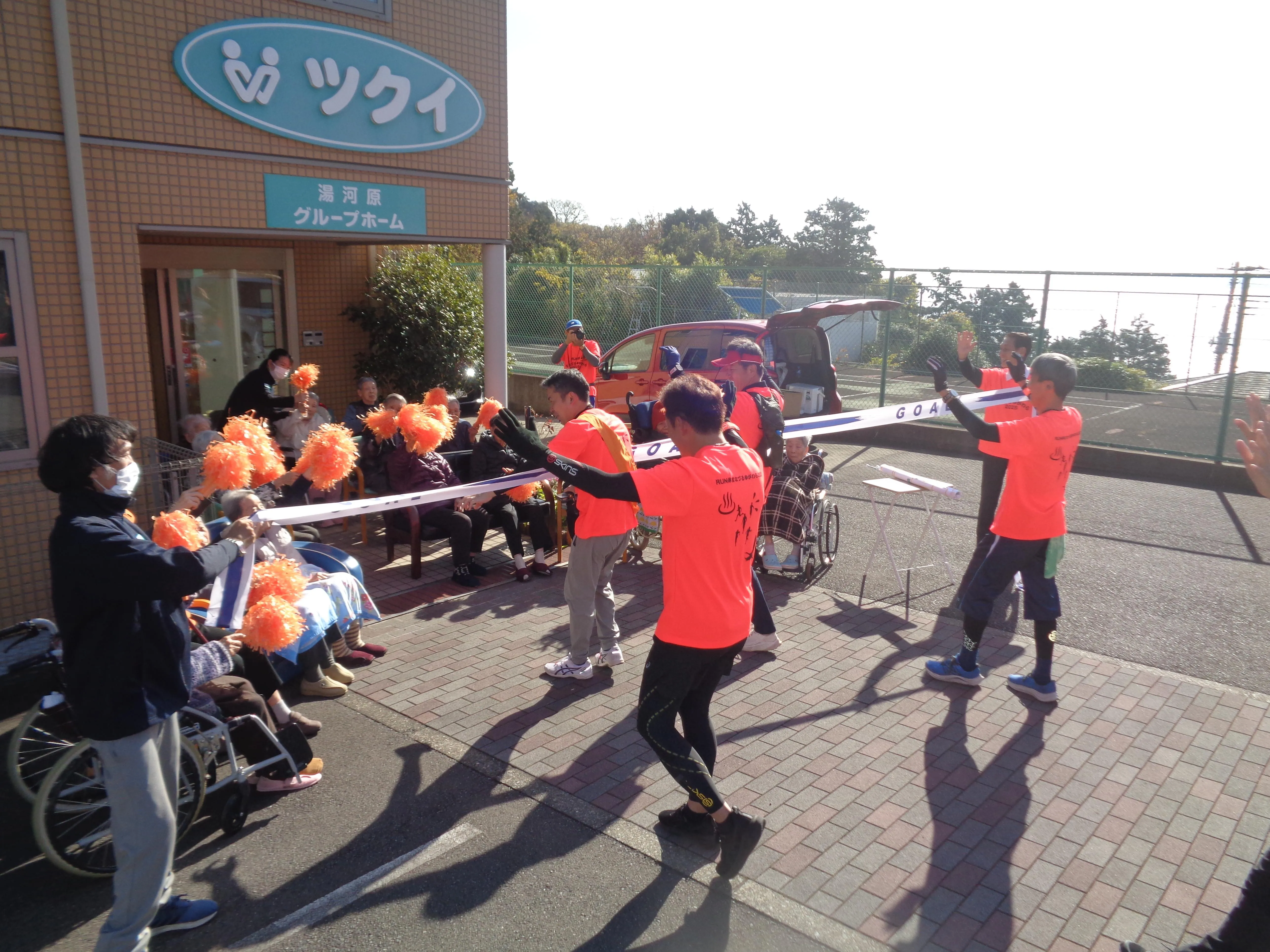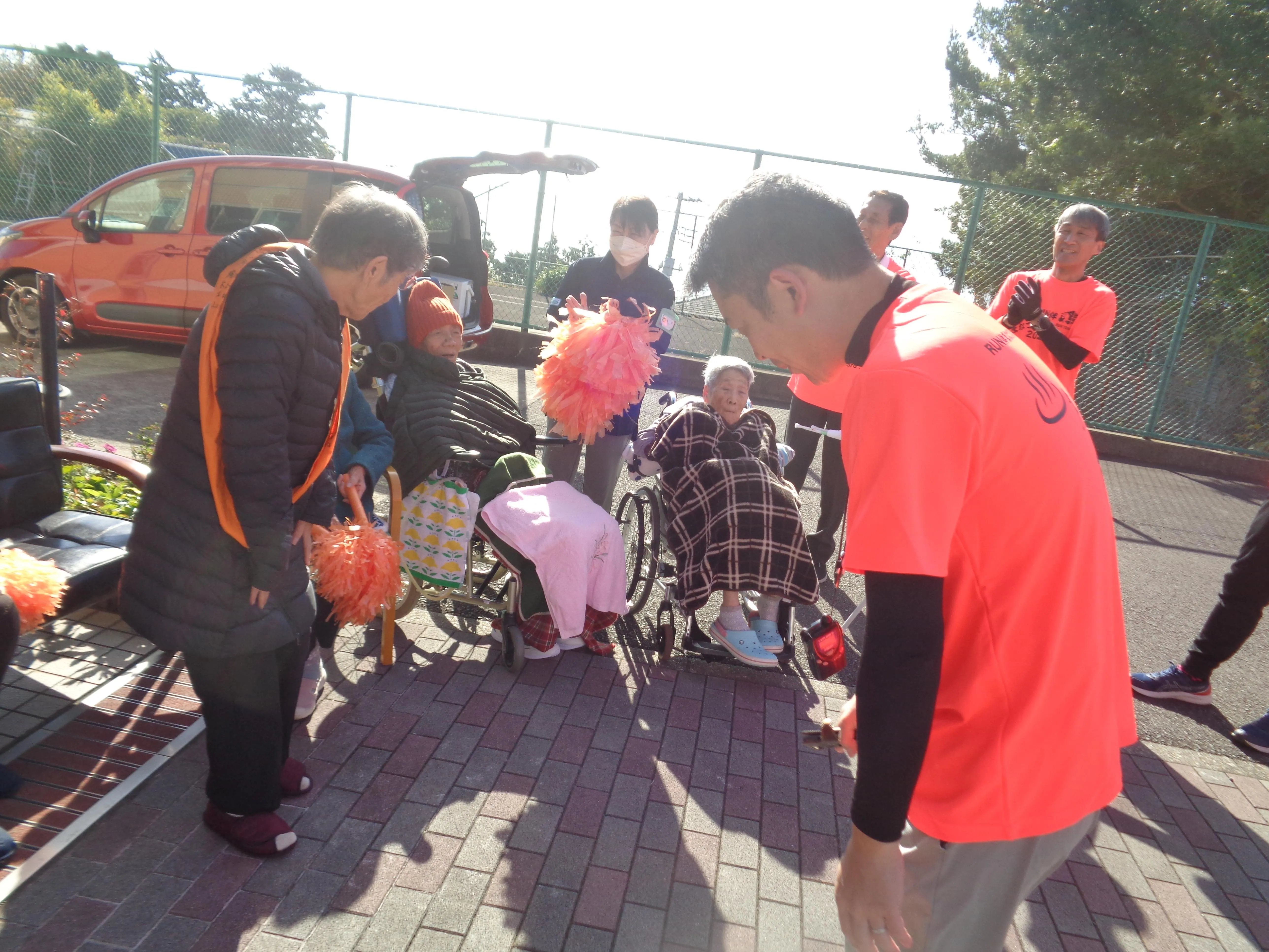 認知症イベントのRUN伴にお客様も参加しました。走ってくるランナーに認知症のカラーのオレンジのボンボンを振って応援しました。