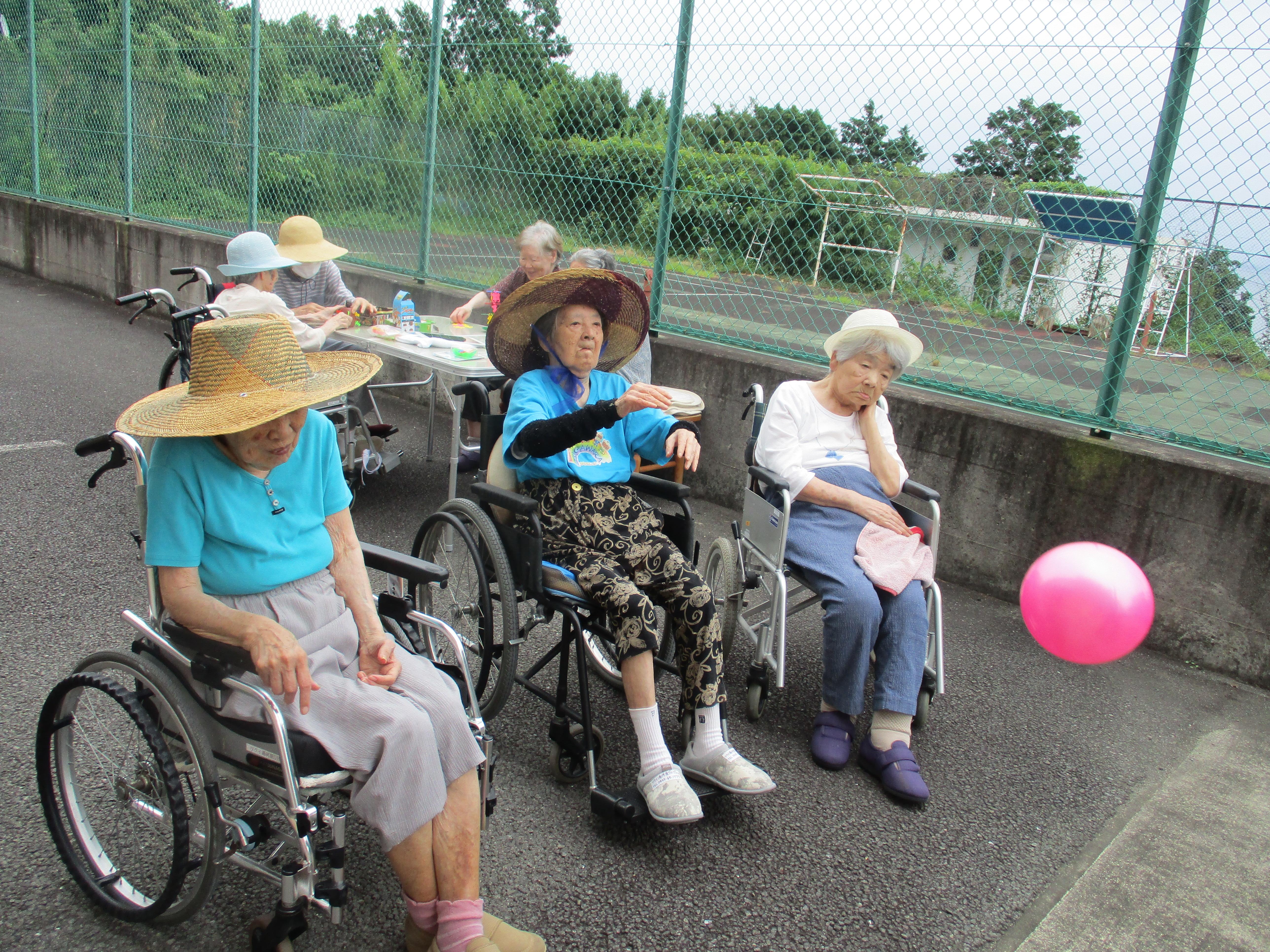 本日は過ごしやすい日でしたので、外気浴をしながら外でのレクリエーションをしました。いつもと違い海を眺めながらのレクリエーションは、職員も気持ちよく行え、お客様も楽しまれていました。