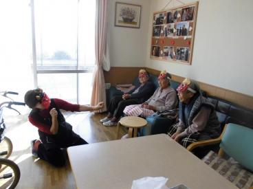 2月に入り、まずは節分です。お客様手作りの鬼の面をつけて、鬼に扮したスタッフに「鬼は外!」と歓声を上げながら、豆まきを楽しみました。