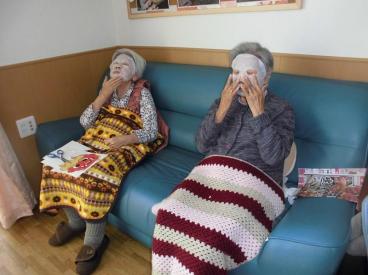 1階あじさいユニットでは、晴れた日の昼下がり、フロアでお肌のお手入れ。パック後のお肌はもちろんピカピカのつるつるで、皆様大満足のご様子でした。