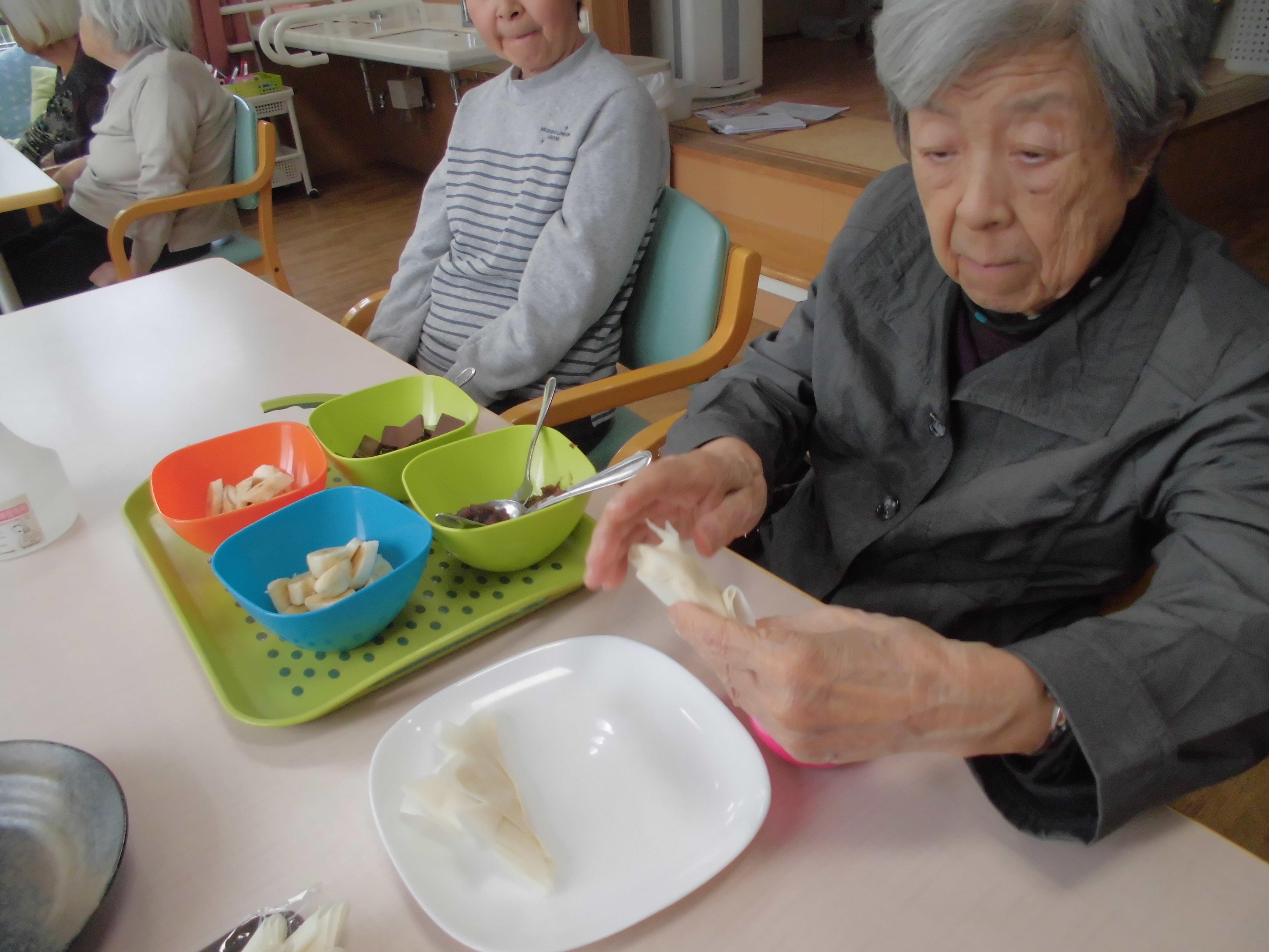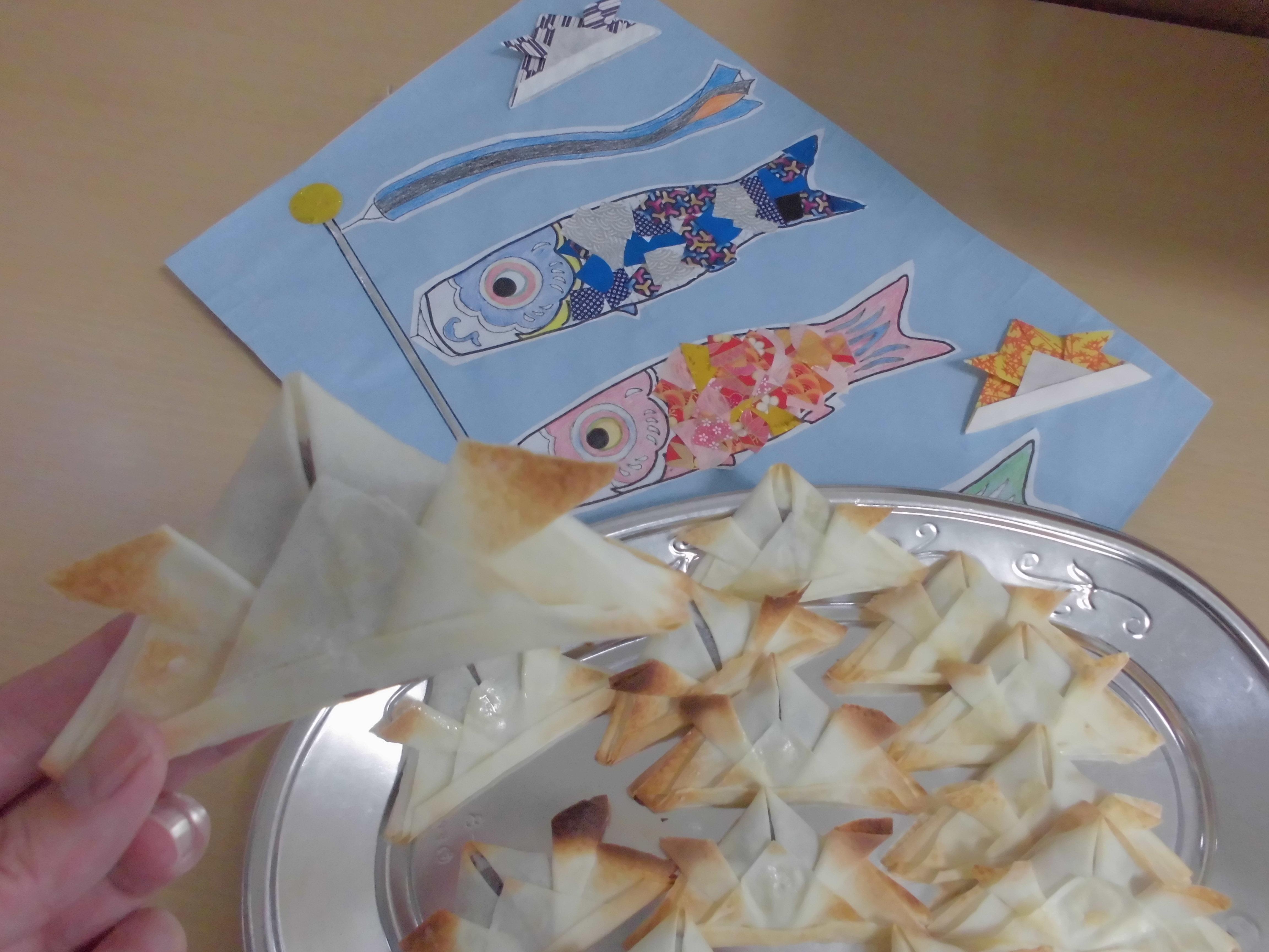 春巻きの皮で兜作りました。中身はあんこやチョコバナナです。皆様あっという間に完食でした。
