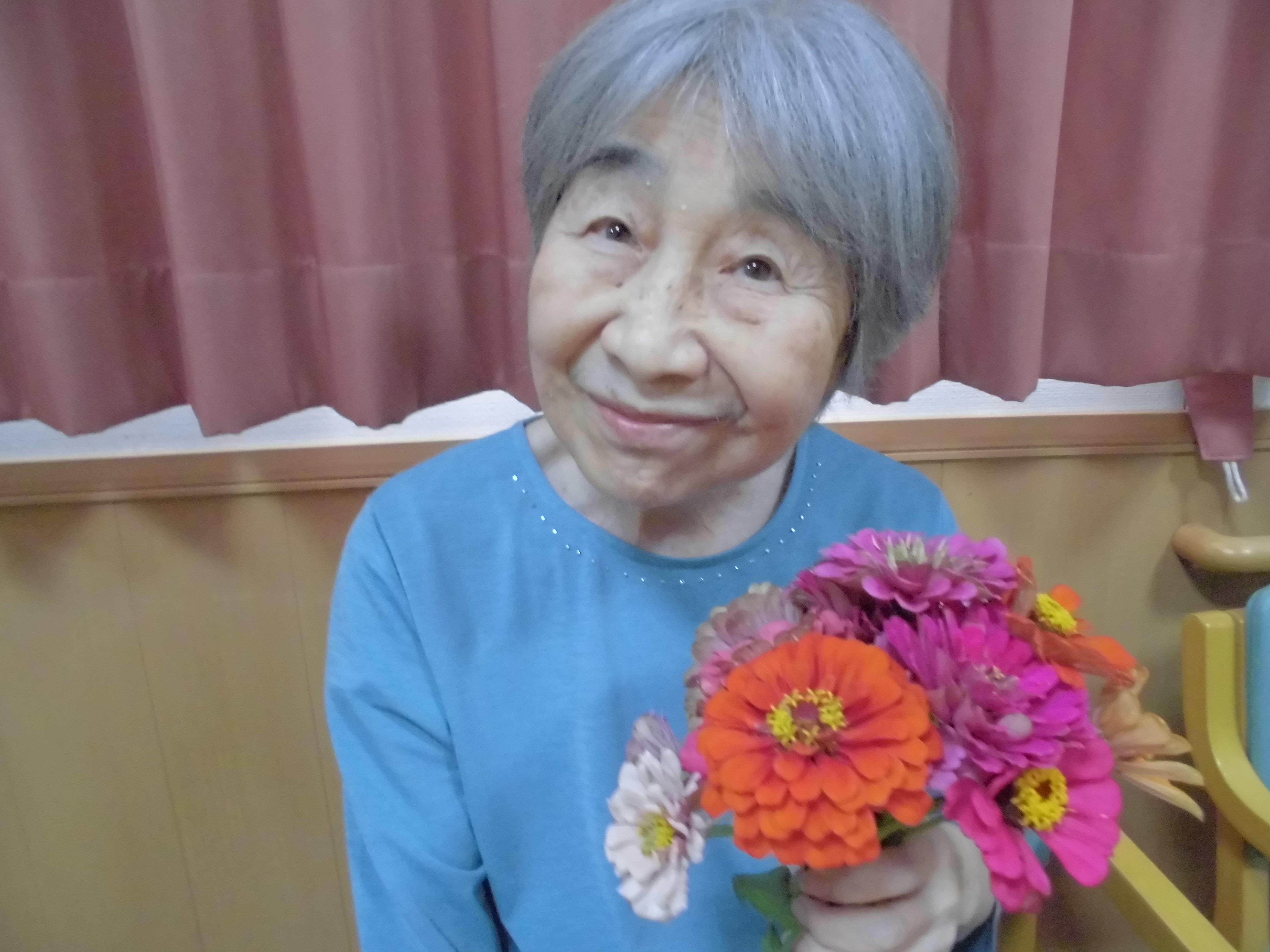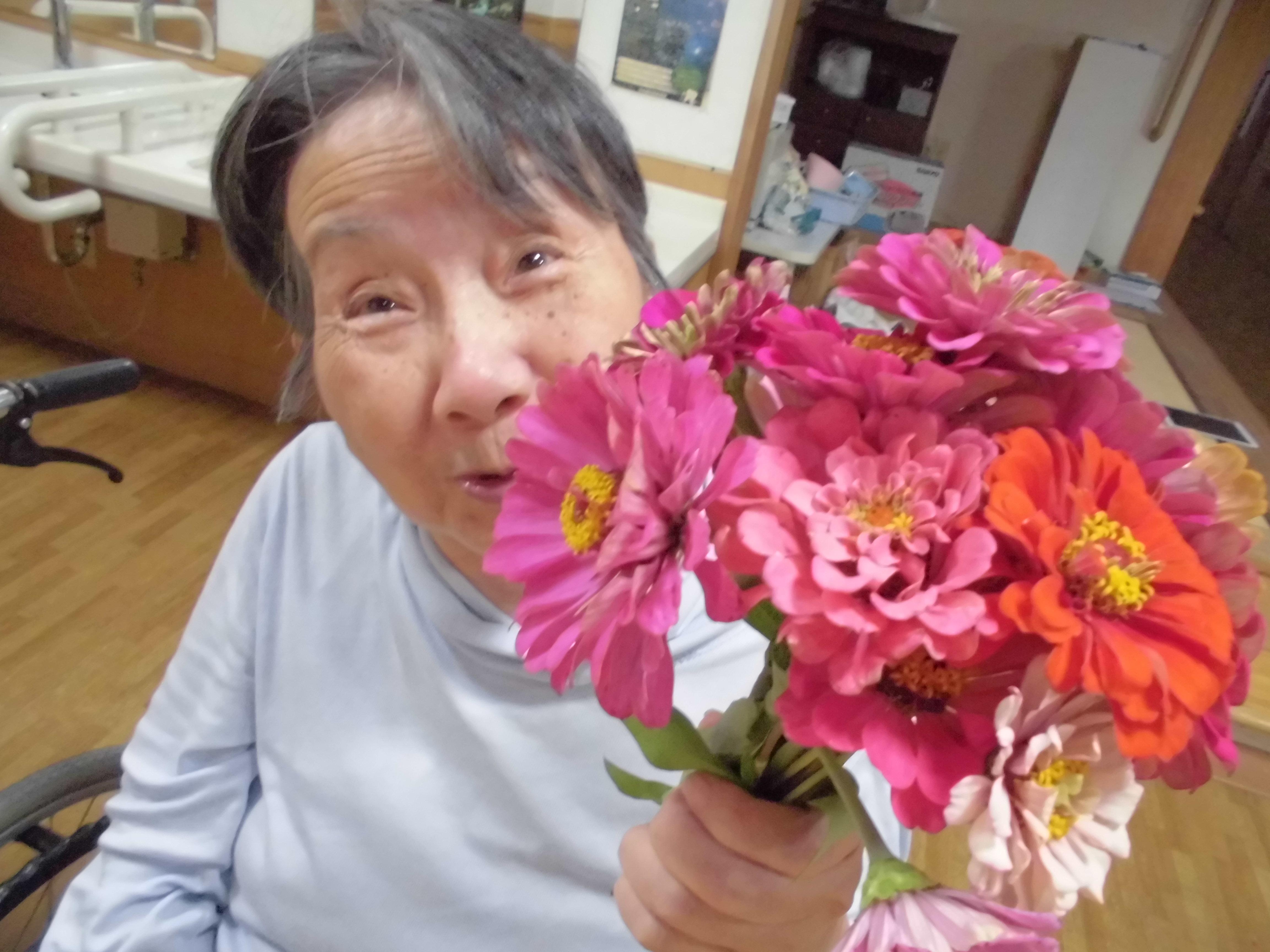 種から育てたマリーゴールドと百日草が、見頃を迎えています。庭で摘んできた花束をお見せしたら、お客様の笑顔も満開になりました。