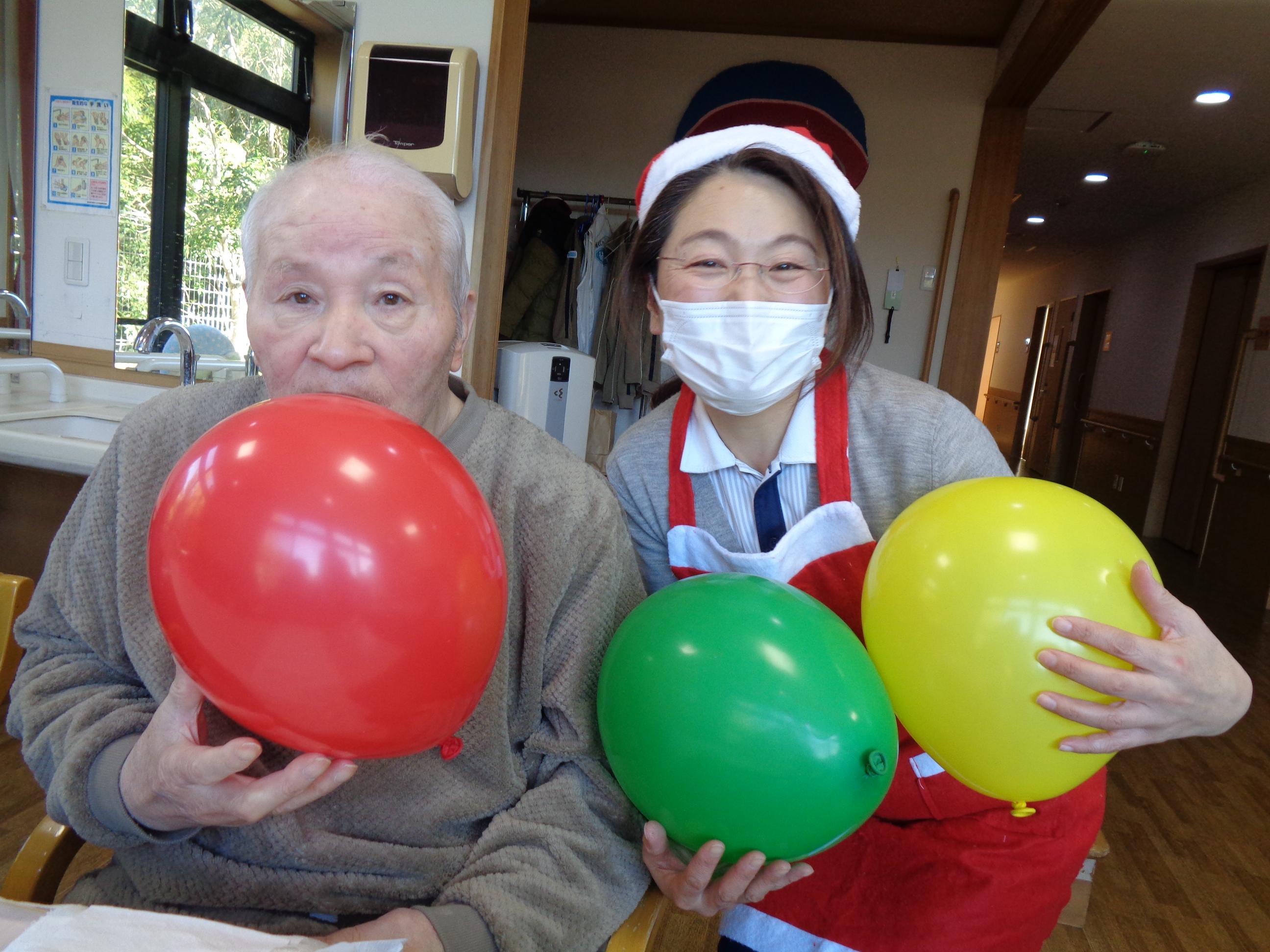 今日はクリスマス会でした。お楽しみのプレゼント交換の前に、風船バレーと輪投げで楽しみましょう。