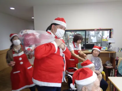 今日はクリスマス会でした。サンタさんが大きな袋を抱えて登場です。