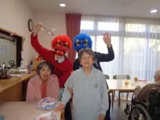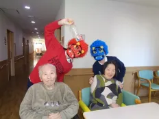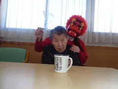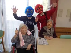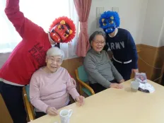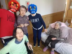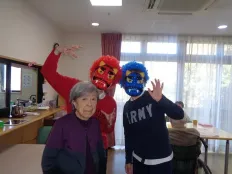 先日ツクイ伊勢原高森グループホームにも赤鬼と青鬼がやってきました。でもお客様は笑顔で要らしたようです。