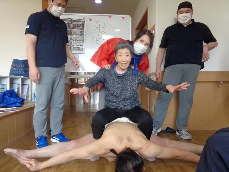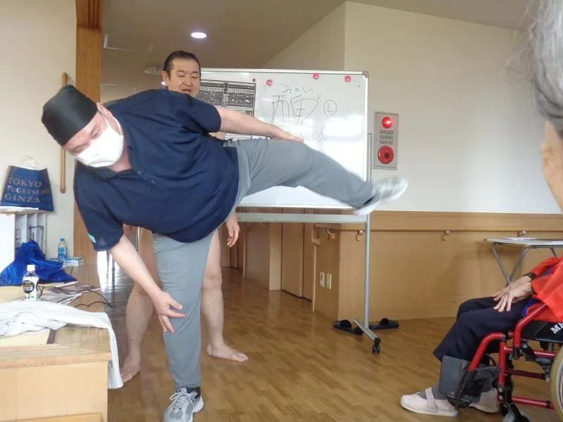 四股の踏み方を教えてくださり、股割りを披露して、上に乗っても大丈夫なのでお客様に乗っていただきました。