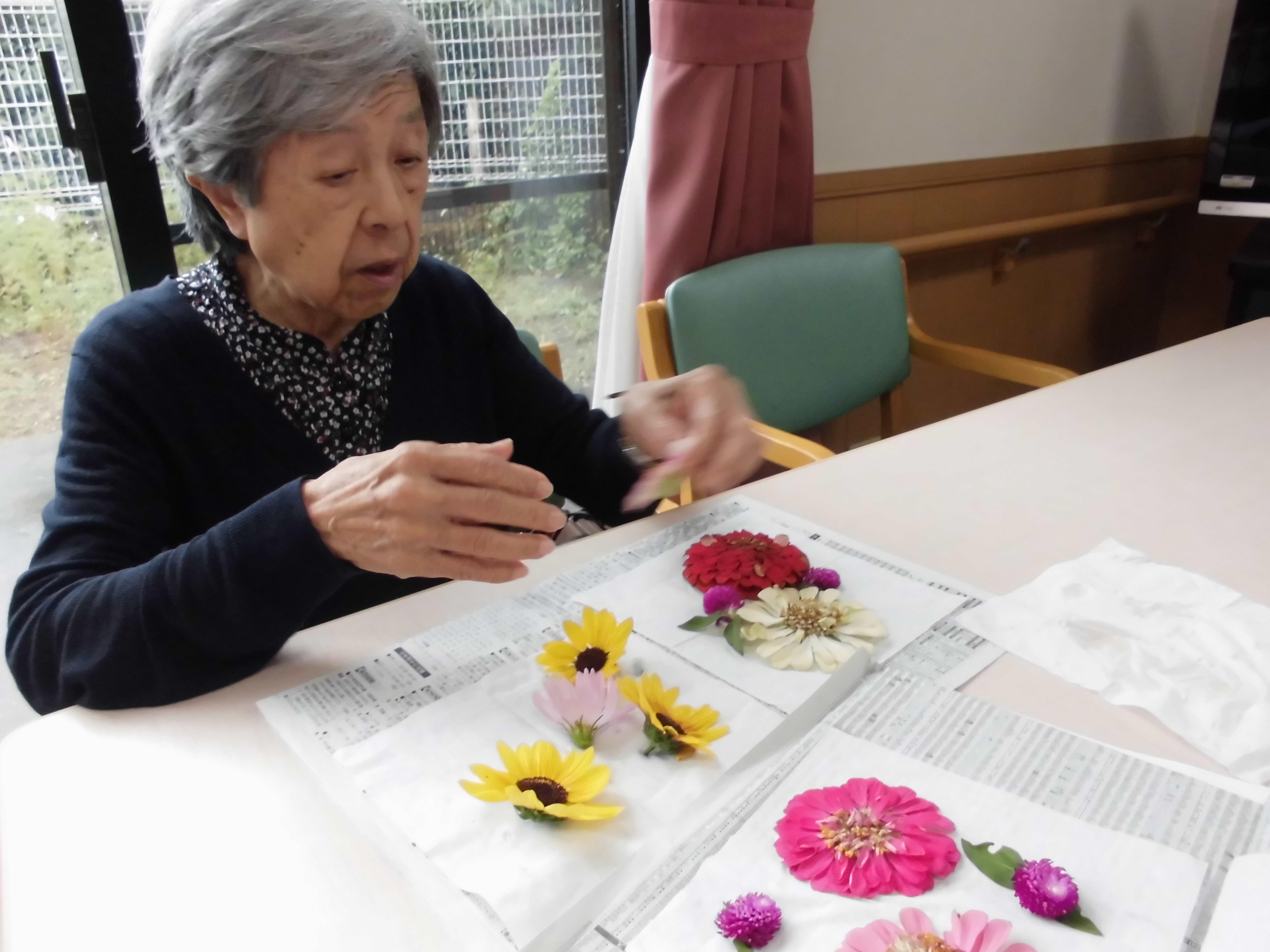 裏庭で咲いている花々を押し花にしました。彩とりどりのお花で、お客様の笑顔のお花も満開になりました。