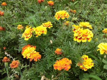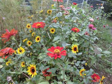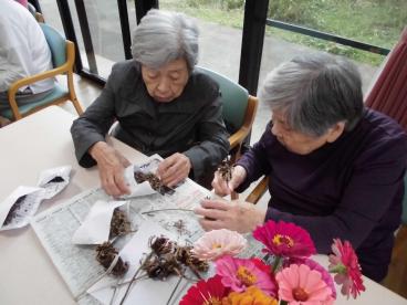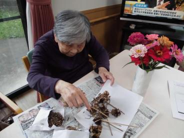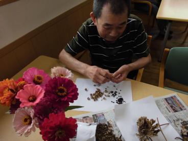 種から植えたマリーゴールドや百日草、コスモスの種取りをしました。