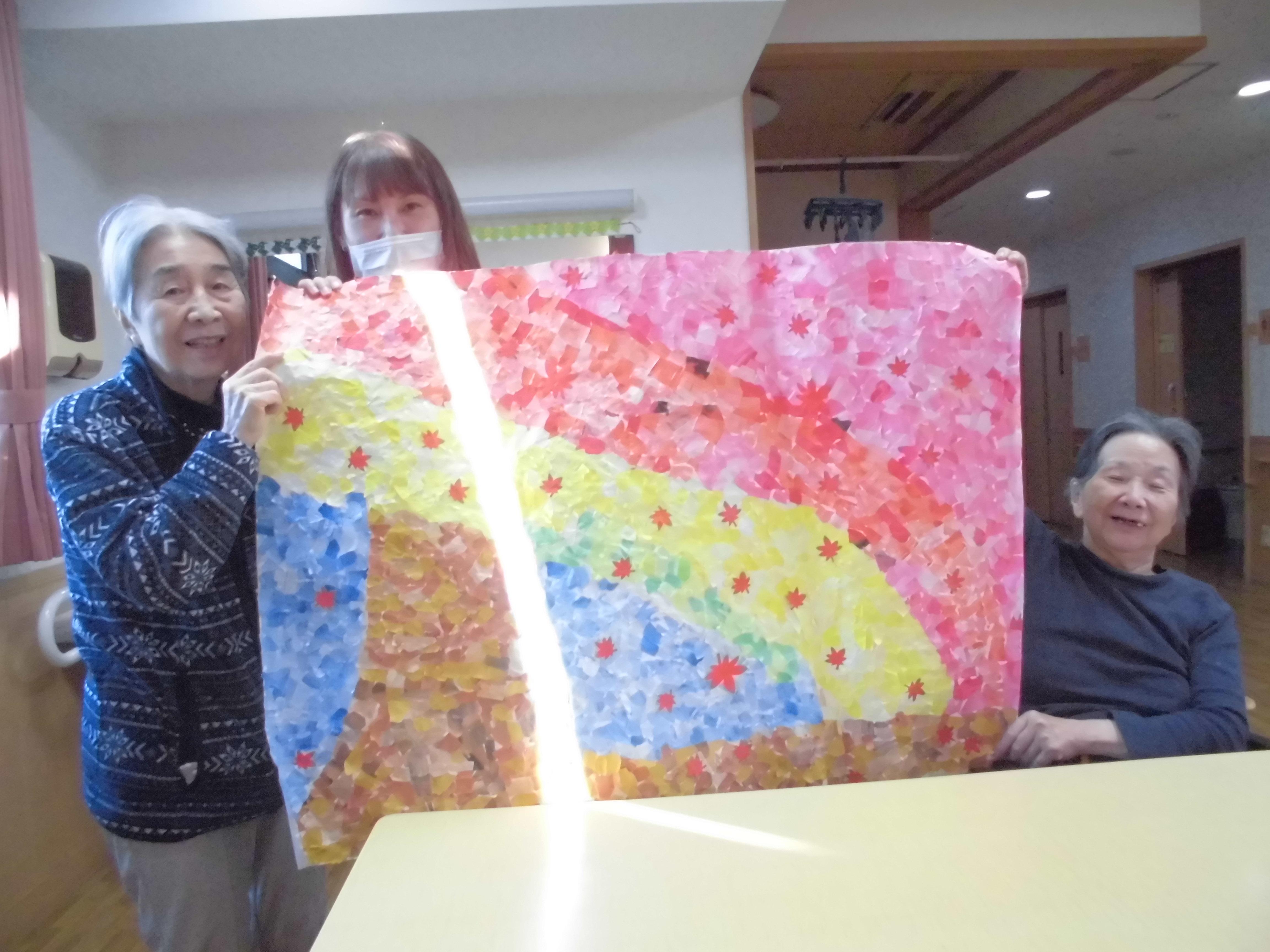 紅葉のちぎり絵が完成しました。大山の紅葉が色づく頃に、高森の紅葉も間に合いました。