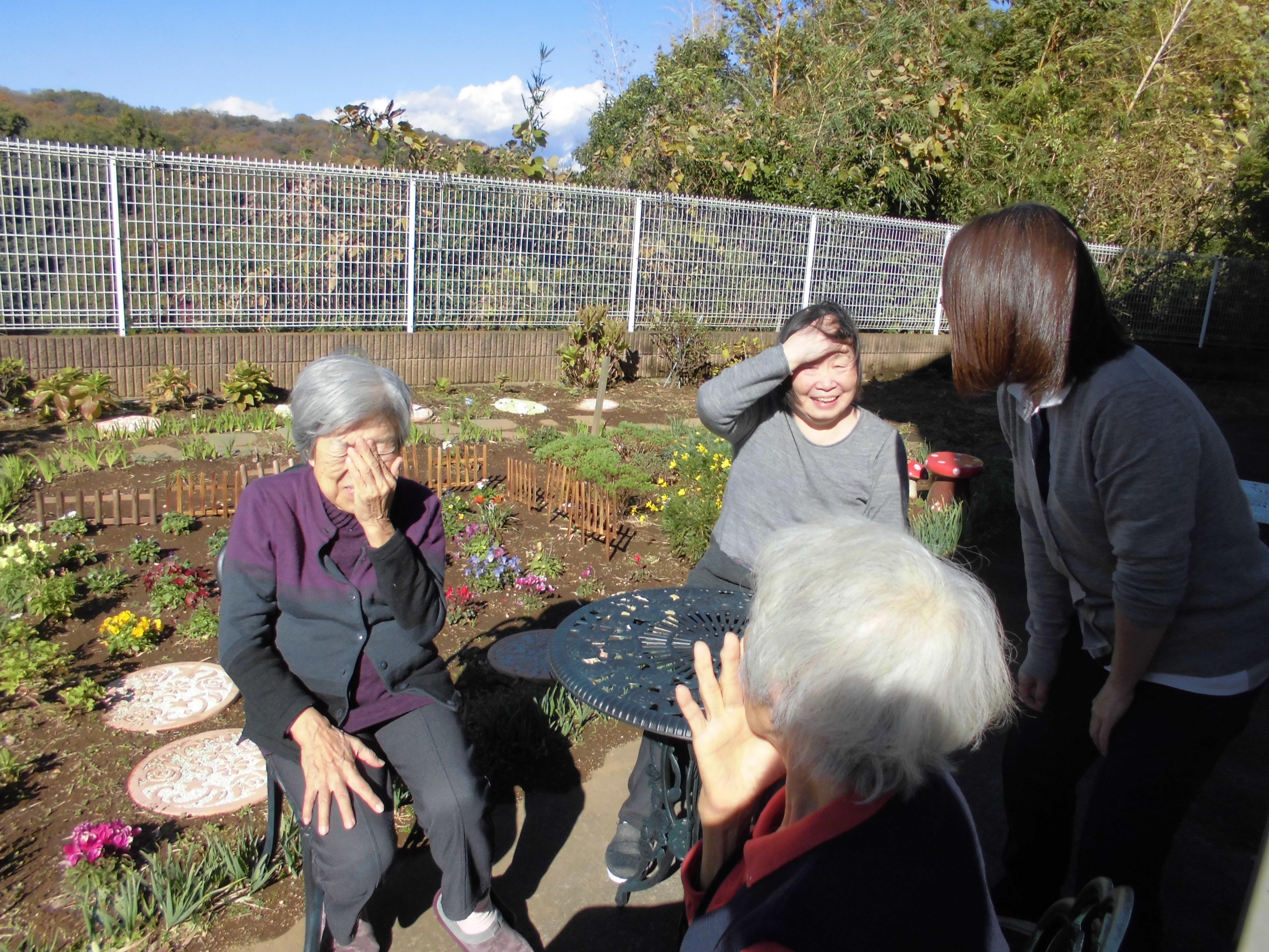 お客様の日々のご様子です。一緒にゲームをしたり、トランプをしたり、賑やかな毎日です。冷え込む日もありますが、温かい日には庭先でお茶会を開催し、座談会の始まりです。朝晩の冷え込みが厳しくなりましたが、どうぞ皆様ご自愛くださいませ。