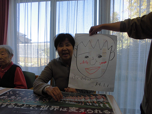大晦日の食事はやっぱり年越しそばですよね。天ぷらをのせて美味しく召し上がって頂きました。その後はみんなで目隠しをしながら、福笑いのお絵かきをしました。皆さんの笑顔で、楽しく年越しする事が出来ました。