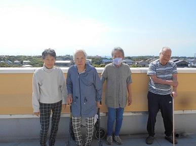 天気が良いので、室内の体操をやめて屋上へ行きました屋上へで軽く体操し、皆様でウォーキング。スタッフも一緒に話しをしながら、大きな屋上を休憩をはさみながら3周。とても良い運動になりました。休憩中はお茶を飲み、冗談を言いながら大笑い。梅雨に入る前に、沢山外へ出る機会を作りたいと思います。