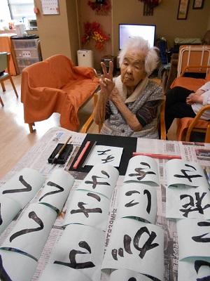 春に向けて壁飾りを作成中お客様に習字で「春が来た」の歌詞を書いてもらいました。お客様やスタッフが歌を歌いながら書ける文字を書いてくれました。筆さばき皆様上手でした。1階には2番を2階には1番を壁に貼っています。早く春が来るのが楽しみです。