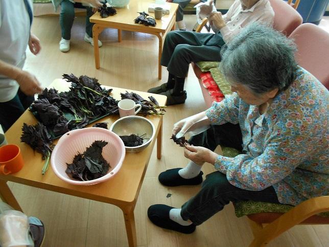 しそを皆でちぎり、鍋てぐつぐつと。