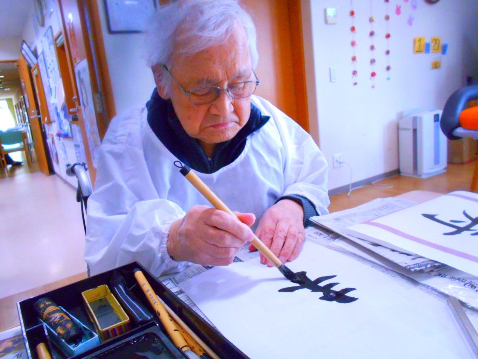 新春書初め大会を行いました。皆様には〈寿〉の字を書いていただきました。「わかんないっちゃー」と話されておりましたがいざ書き始めると綺麗な字ですらすらと書いておられました。