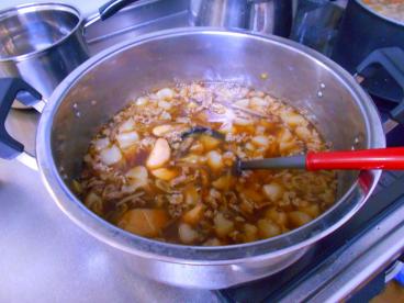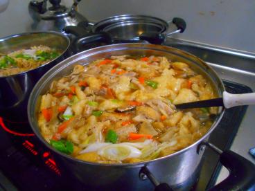 こちらは盛岡のひっつみ鍋です。しょうゆベースの鍋にキノコ、油揚げ、ゴボウ、ニンジンと具沢山で小麦粉を練ったものを入れる満足感溢れる鍋となりました。